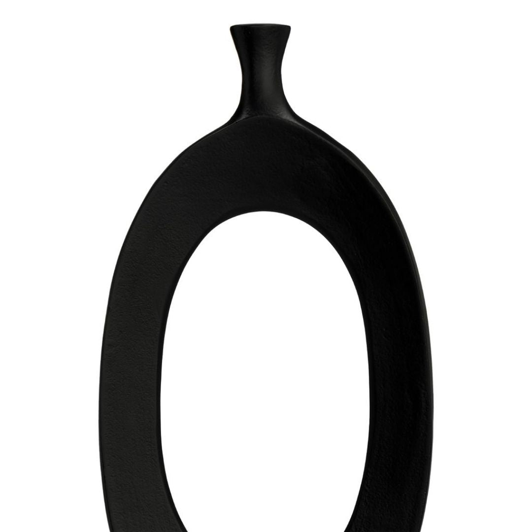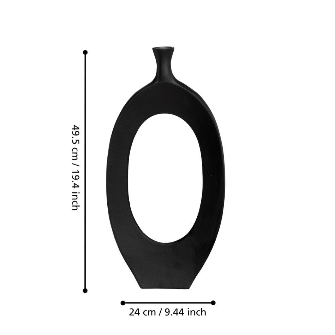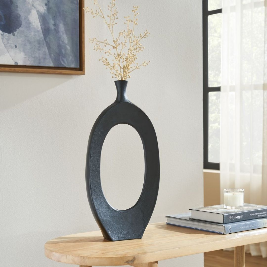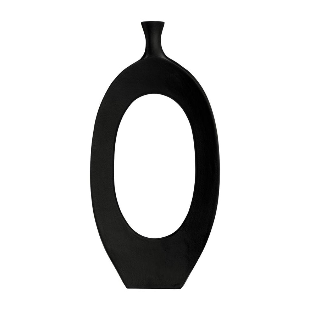 The Ankarefo vase is a bold decorative piece with a contemporary edge. Crafted from aluminium and finished in matte black, it features a distinctive round form with a central cut-out, creating a striking silhouette that plays with shape and negative space. Perfect as a standalone statement or styled with dried stems, this modern vase adds an artistic touch to consoles, shelves and sideboards.