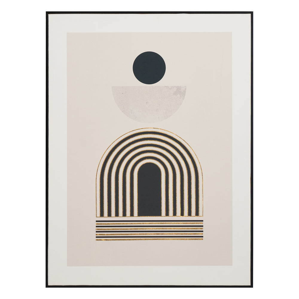 An Art Deco print with a Scandi feel. This stunning print features elegant gold detail, which contrasts the striking black linear design. With a soft stone coloured background, this print is a neutral dream. Finished with a black frame, this is the perfect addition to any wall.