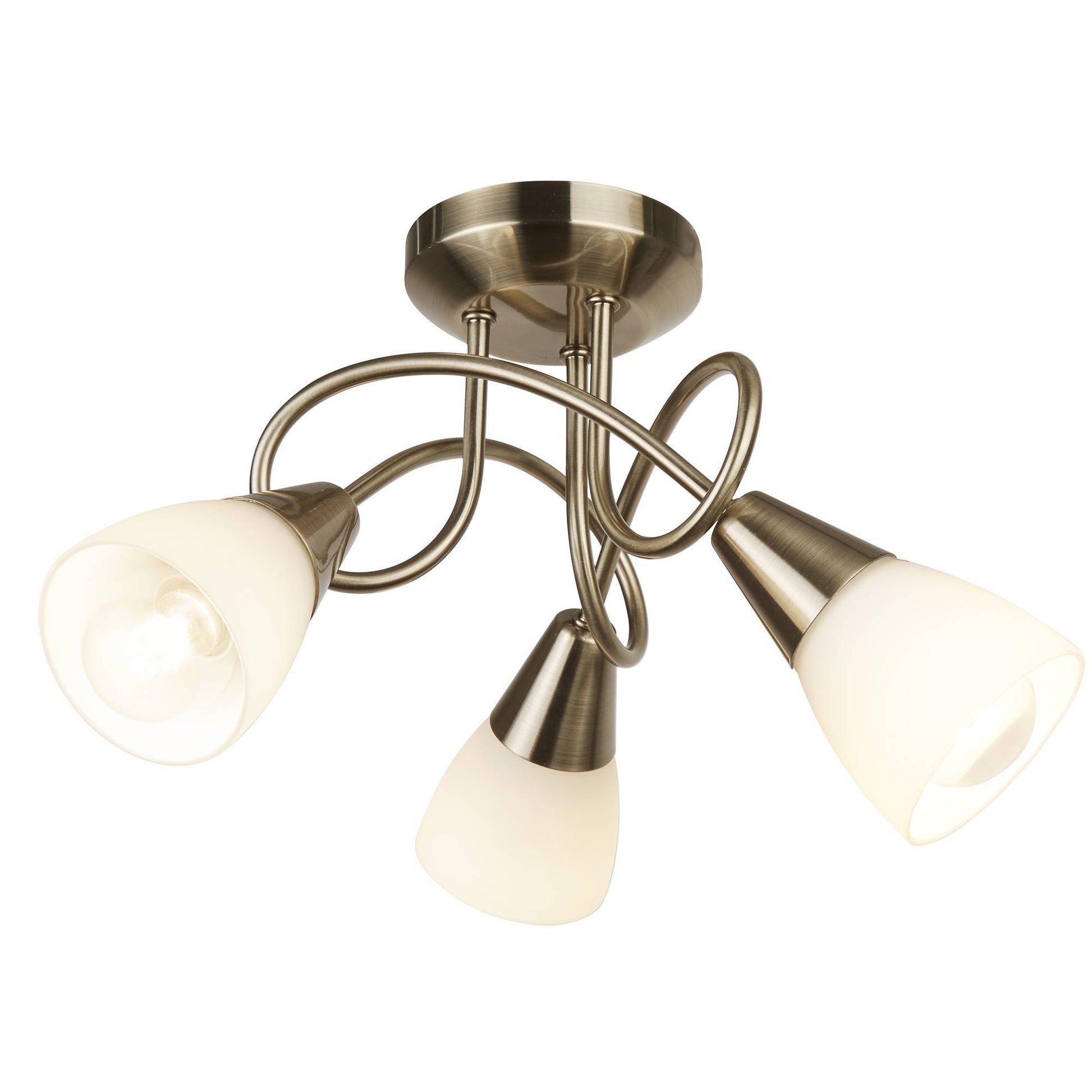 The elegant Bronx 3 Light Semi Flush Ceiling Light features 3 intertwined arms finished in antique brass with delicate opal glass light shades. This ceiling light will add a sophisticted touch to your home decor.