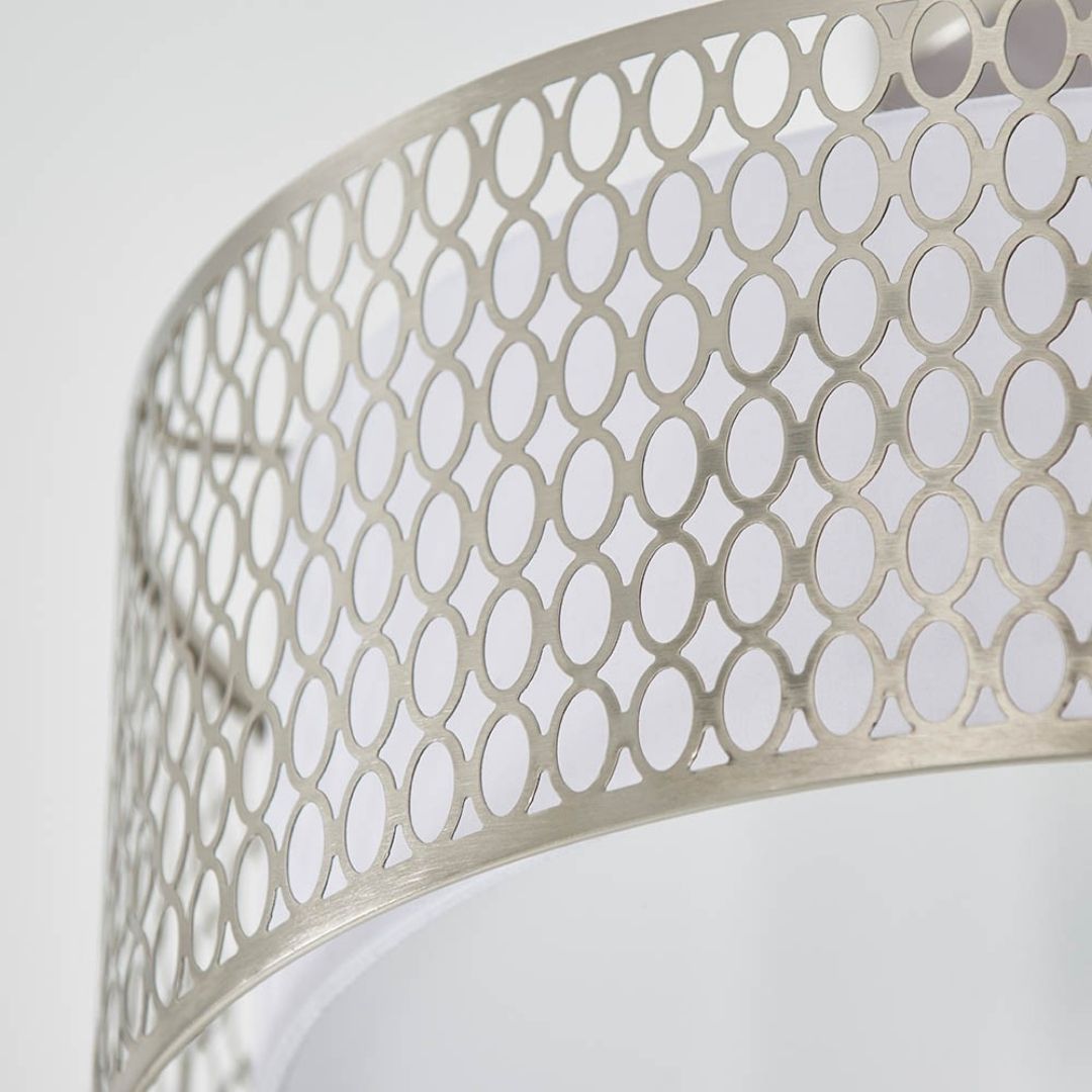 Cordero 3-light flush ceiling light, a classic circular light with a geometric fretwork metal outer, an inner white fabric shade, a satin nickel plated finish and a frosted glass diffuser.