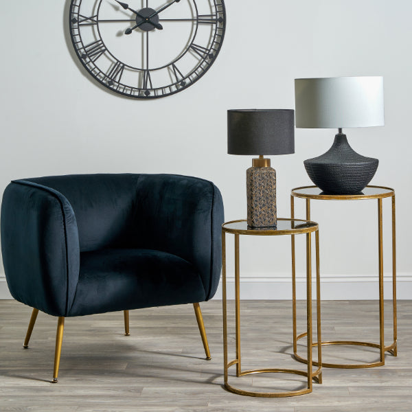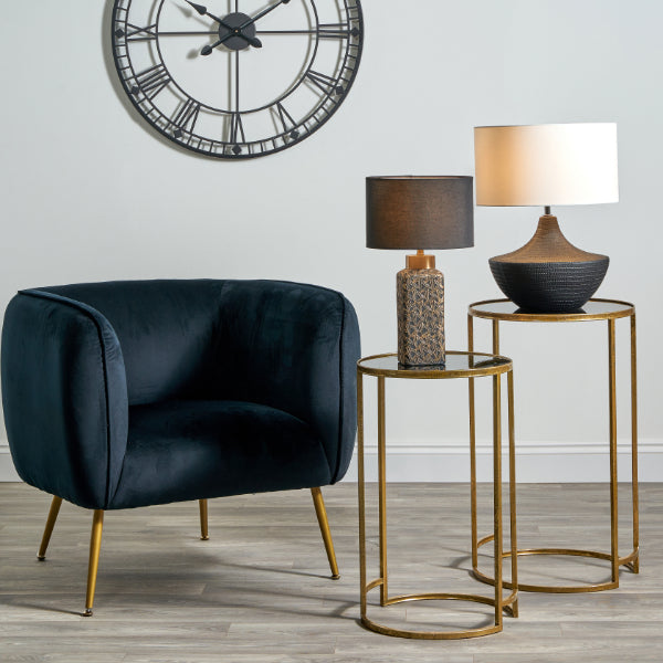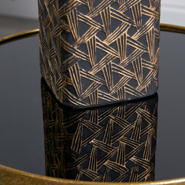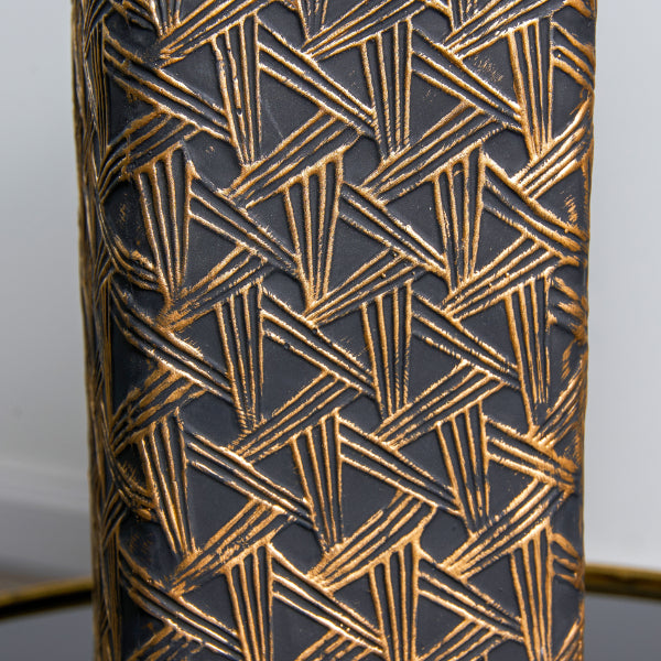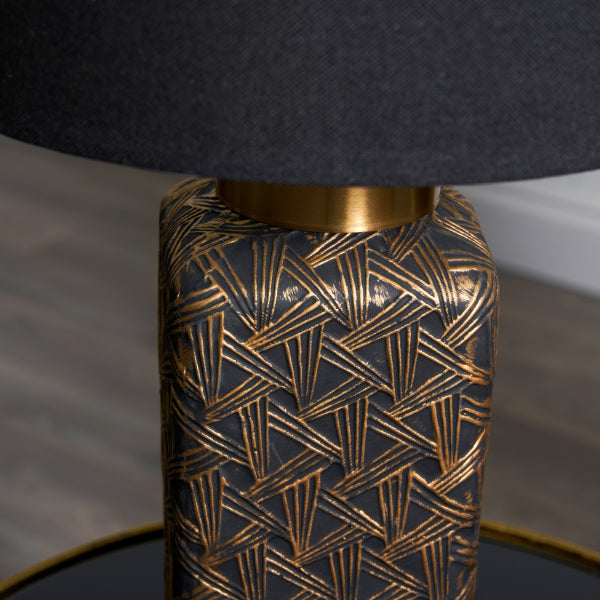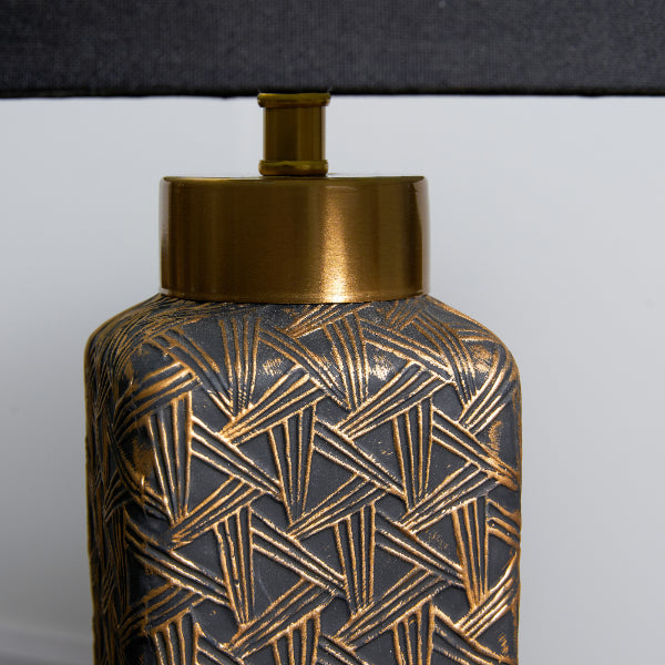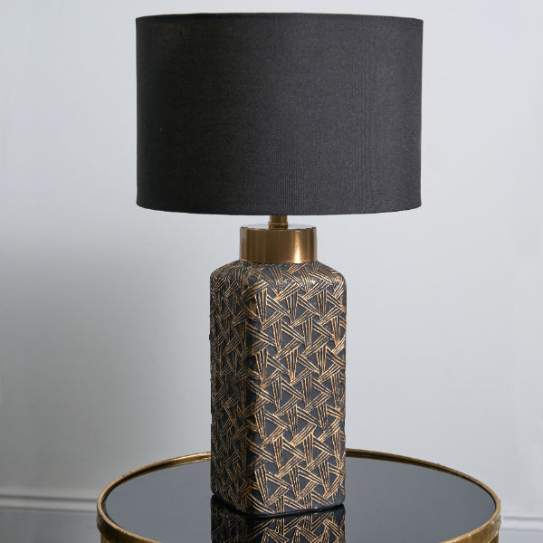 The Denisa table lamp is a refined and modern piece that brings a sense of luxury to any room. It features a bold black circular shade that softens the light, paired with a black base adorned with a striking gold geometric pattern. Accented with gold detailing, this lamp adds a touch of opulence and contemporary flair to bedsides, consoles or side tables. The Denisa lamp is both functional and decorative, offering a sophisticated finishing touch to your interior décor.