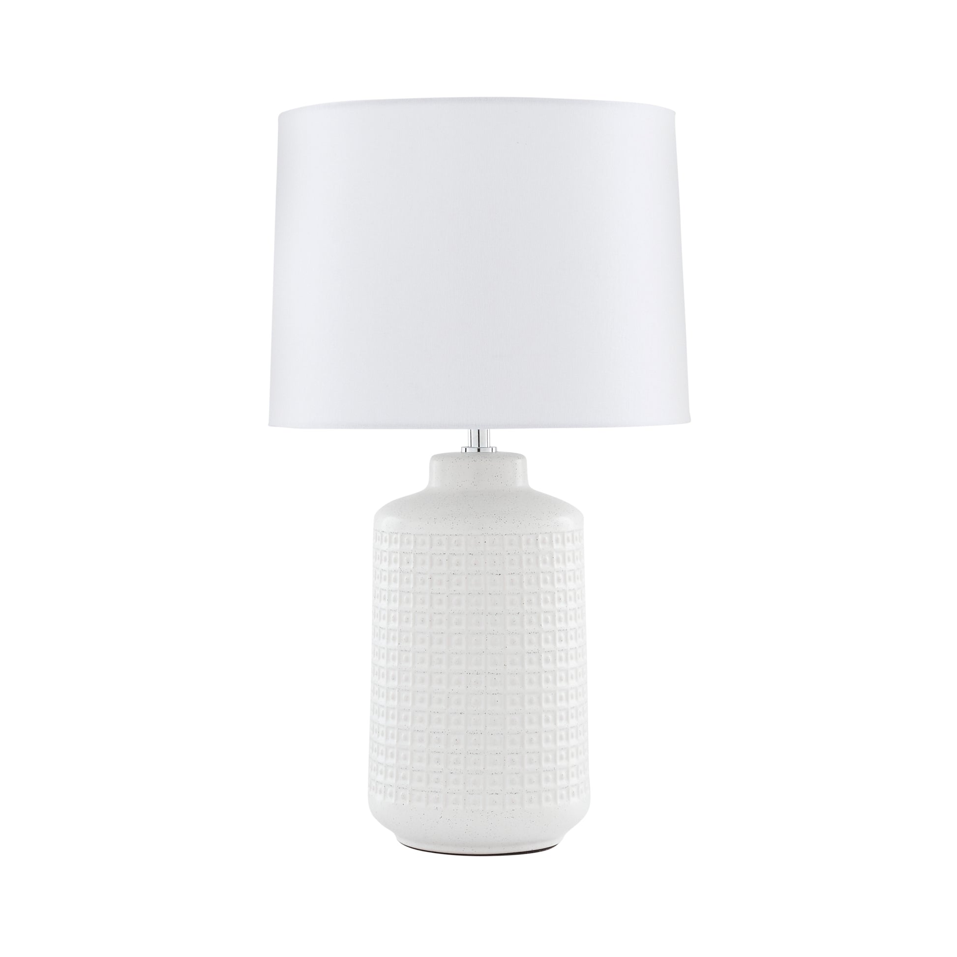 This harmonious lamp's off-white ceramic base adds texture and visual interest while maintaining a neutral palette that complements any decor, while the matching cotton shade enhances the lamp’s cohesive look, providing a soft, warm glow that creates an inviting ambiance. The speckled ceramic base showcases a tactile finish that adds a touch of sophistication and charm. Its clean, understated design makes it a versatile addition to various interior styles, from modern and minimalist to coastal and transitional. The Ebbie table lamp’s cotton shade gently diffuses light, making it ideal for living rooms, bedrooms or home offices where a calming and pleasant lighting environment is desired. Its compact and stylish design ensures it fits perfectly on side tables, nightstands or desks, offering both functional lighting and a chic decorative accent.