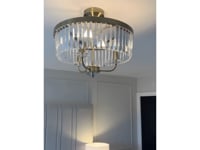 Bring classic charm to your home with this stunning ceiling light, with an antique brass finish metal frame and clear faceted bobèche glass details that catch sunlight, with a handy dimmable function.
