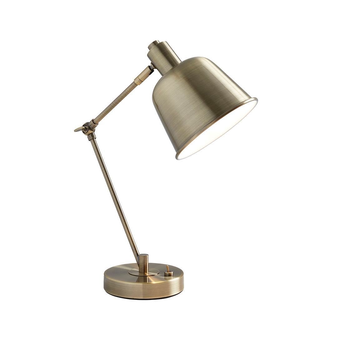 The Erik Antique Brass Metal Table Lamp blends classic design elements with user-friendly features. Its adjustable arm and height allow you to easily position the light for focused task lighting or softer ambient illumination. The antique brass exterior paired with the crisp white gloss interior creates a refined contrast, ensuring the lamp looks as good switched on as it does off.