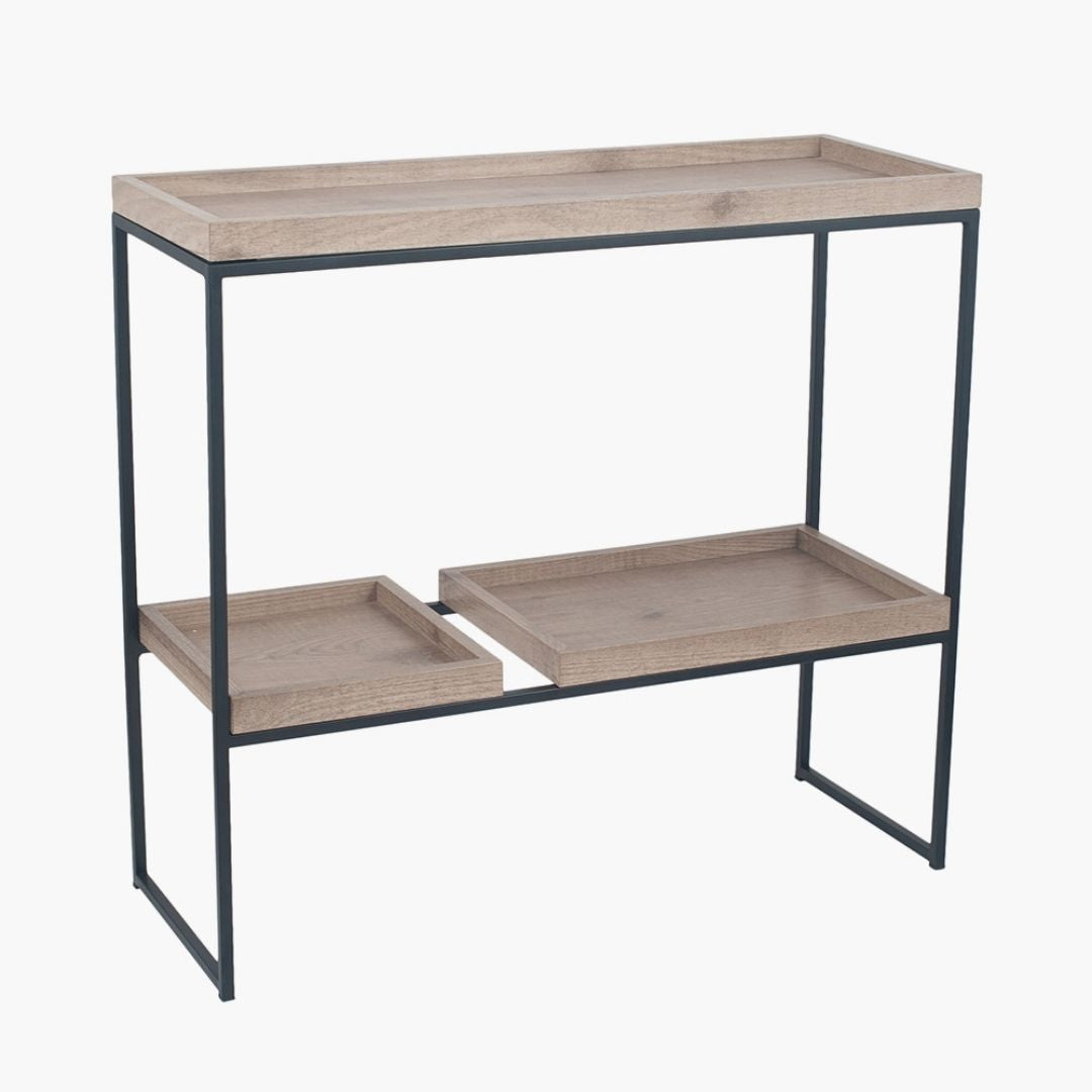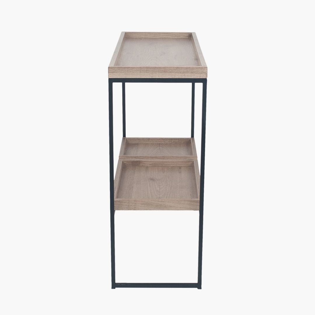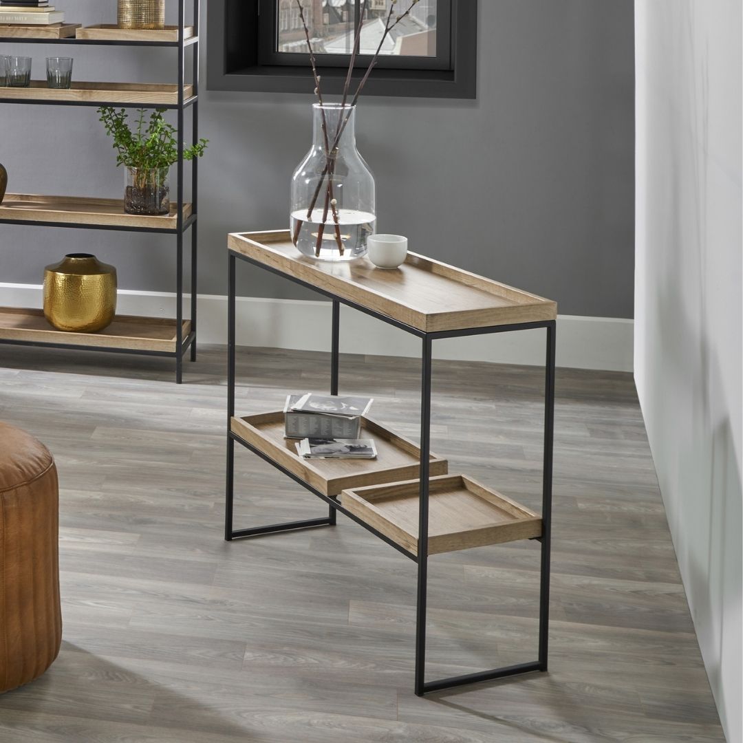 Update your home with this trend-setting statement unit, perfect for displaying your most-loved possessions. With n industrial vibe, this matte black metal console unit features moveable rustic wooden veneered shelves allowing you to customise your displays and be creative. Perfect as industrial shelving in living rooms, bedrooms and hallways.