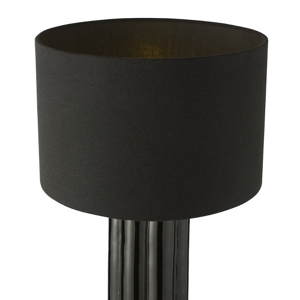The Hebron table lamp makes a bold statement with its statuesque form and contemporary elegance. Its ceramic base, finished in a glossy black glaze with oversized ripples, creates movement and shadow for striking visual depth. A black linen shade with matching lining sits atop a sleek black stem, casting a warm, atmospheric glow that enhances the lamp’s sense of drama. Finished with a luxury braided cable and inline switch, this lamp combines refinement with presence. The tall column silhouette provides height without overwhelming smaller surfaces, making it ideal for living rooms, reception areas, larger bedrooms, or hallways.