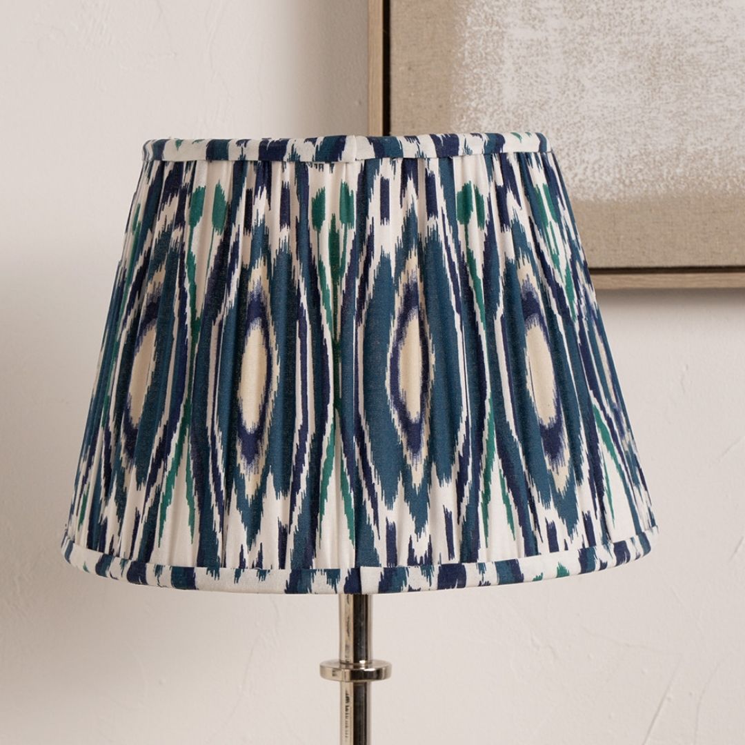 Izara 45cm cotton-gathered tapered shade, featuring a blue Ikat pattern and mushroom pleating.