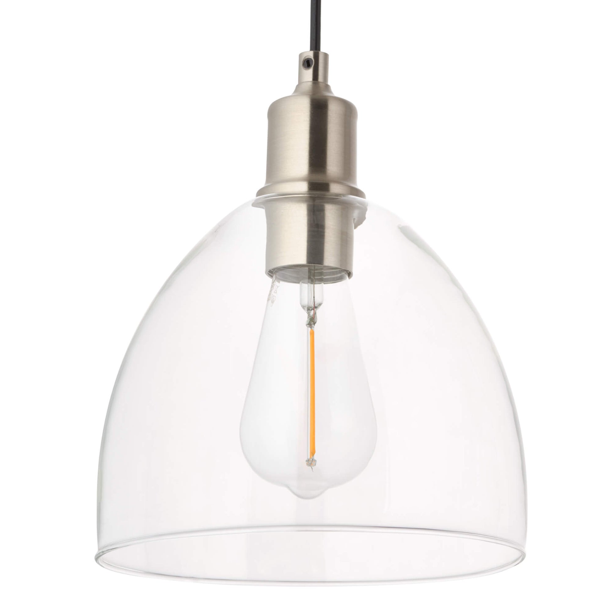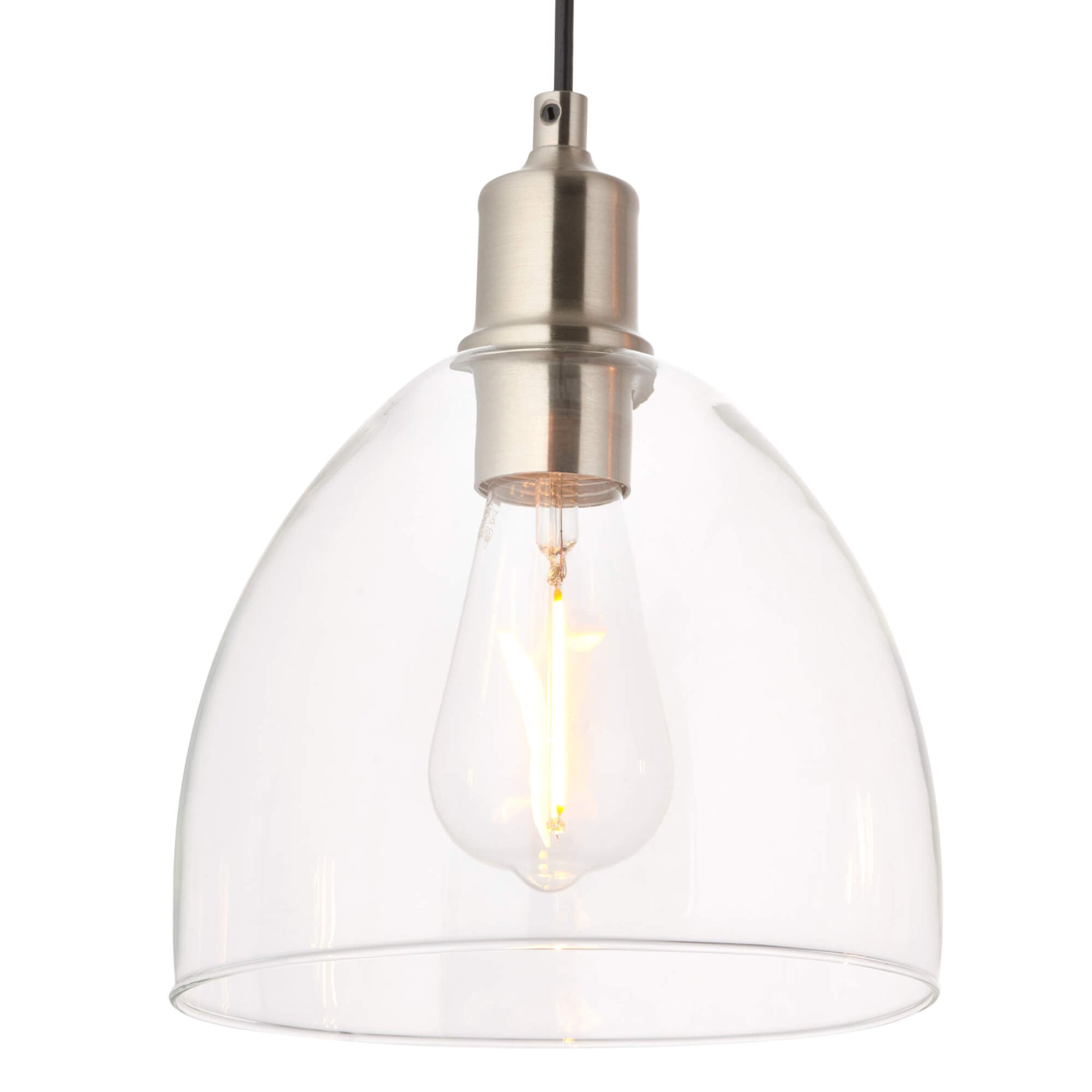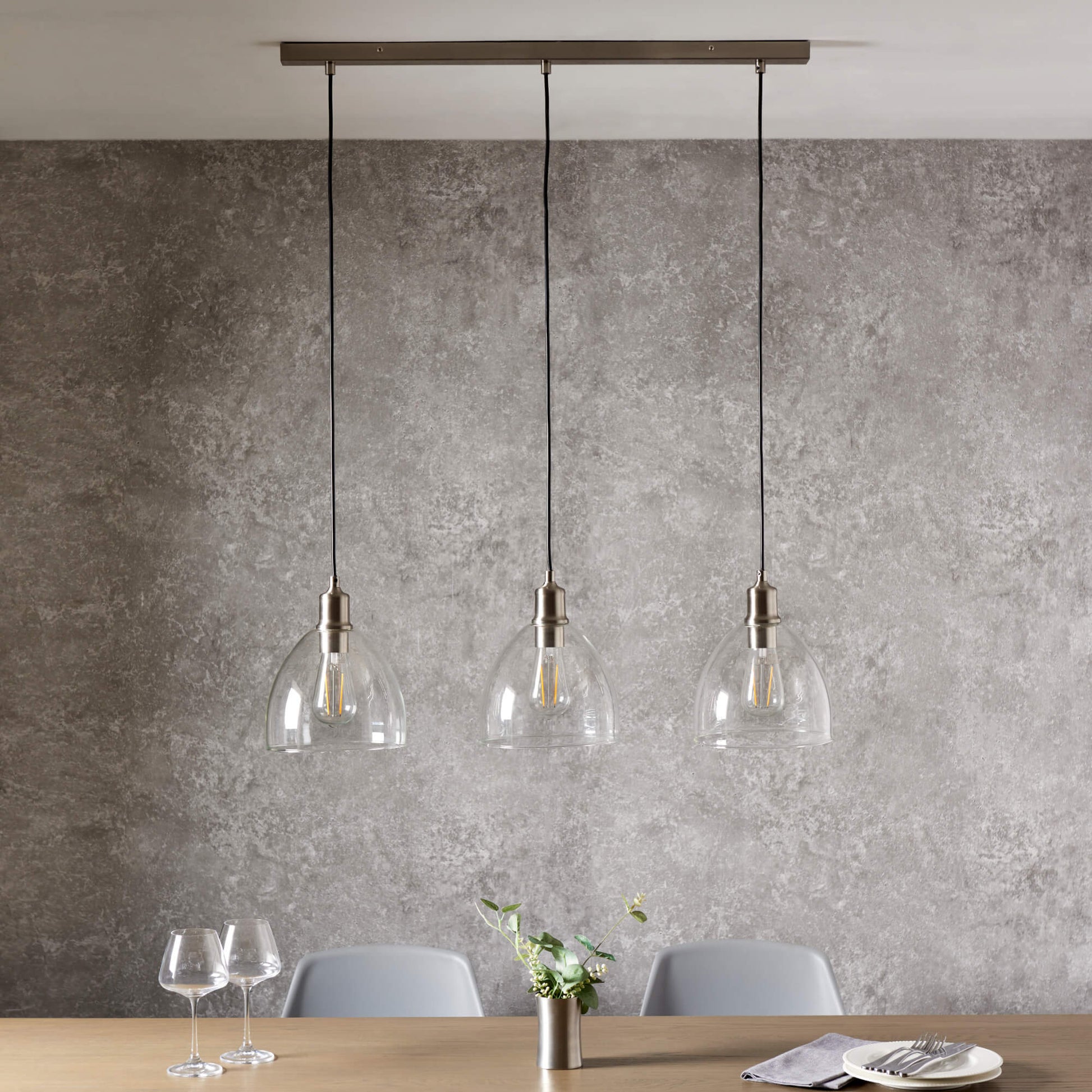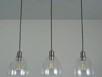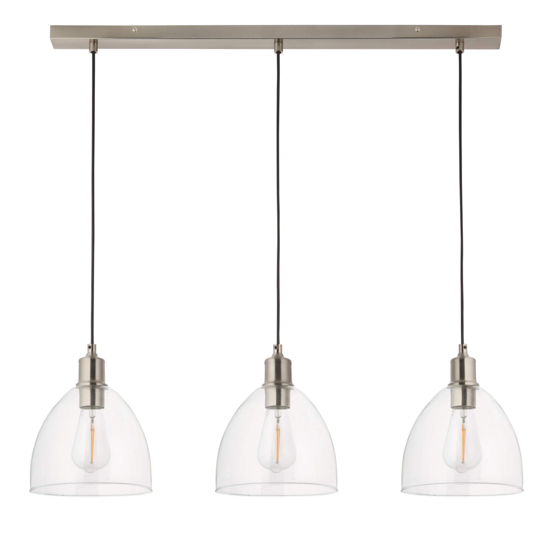 A retro industrial style 3 light linear pendant bar, finished in a bright nickel plating with clear glass shades. Pair it with filament LED lamps for that perfect industrial style. Ideal for above a breakfast bar or dining table making the perfect addition for today's stylish homes to create that on trend bar, bistro look. An adjustable drop between 40 to 130 cm allows for flexibility and easy positioning in your chosen space.
