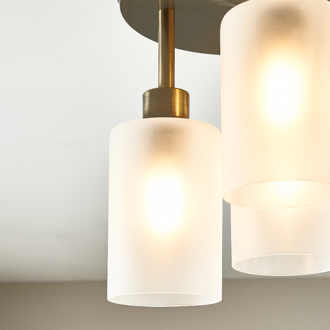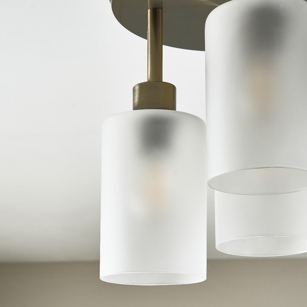 The Kingsholm 3-Light Semi-Flush Plate is a Pagazzi Lighting exclusive that blends traditional elegance with modern functionality. Finished in a warm antique brass plate and paired with frosted glass shades, this fitting offers a timeless look for any interior.