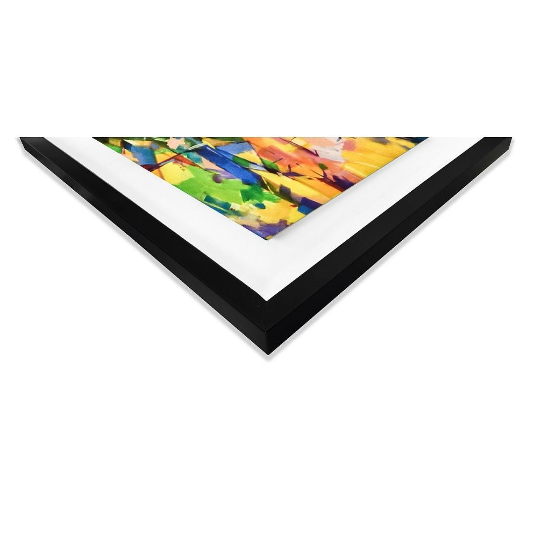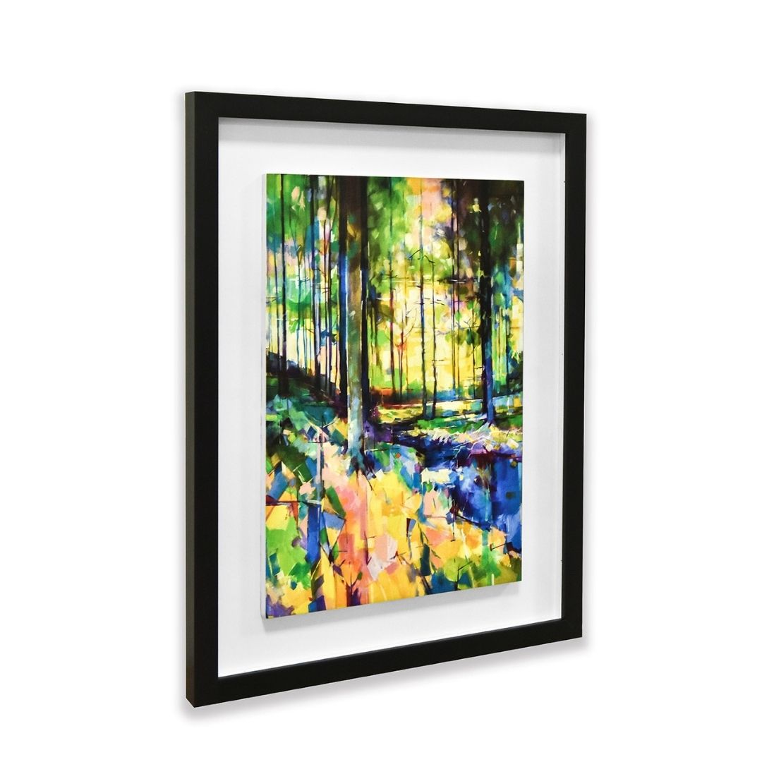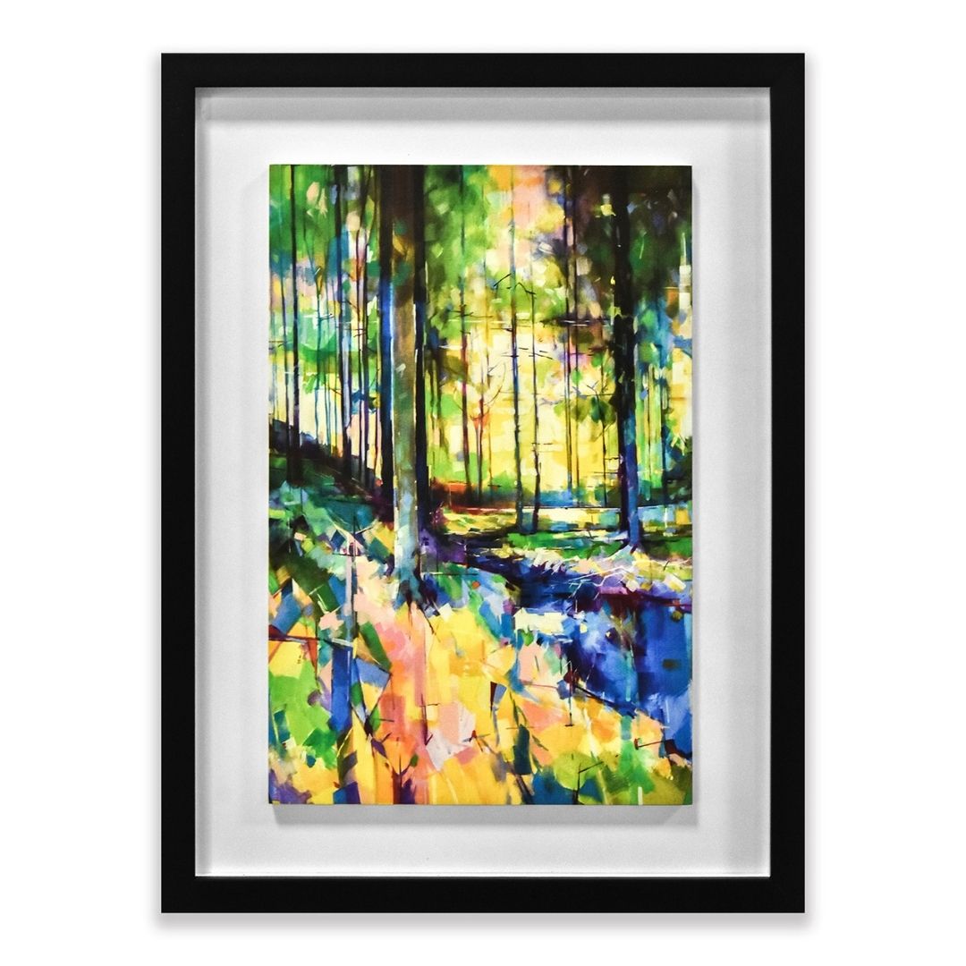 Little Staple Edge Forest by Doug Eaton blends contemporary style with natural inspiration. The artwork presents a bold and vivid abstraction of a forest scene, where shafts of light break through the trees and dance across the foliage. A river winds through the composition, reflecting the filtered light and adding a sense of depth and movement. The colours are rich and expressive, bringing the woodland to life with a dynamic mix of texture and energy. A striking piece that captures the atmosphere of the forest in a modern, artistic form.