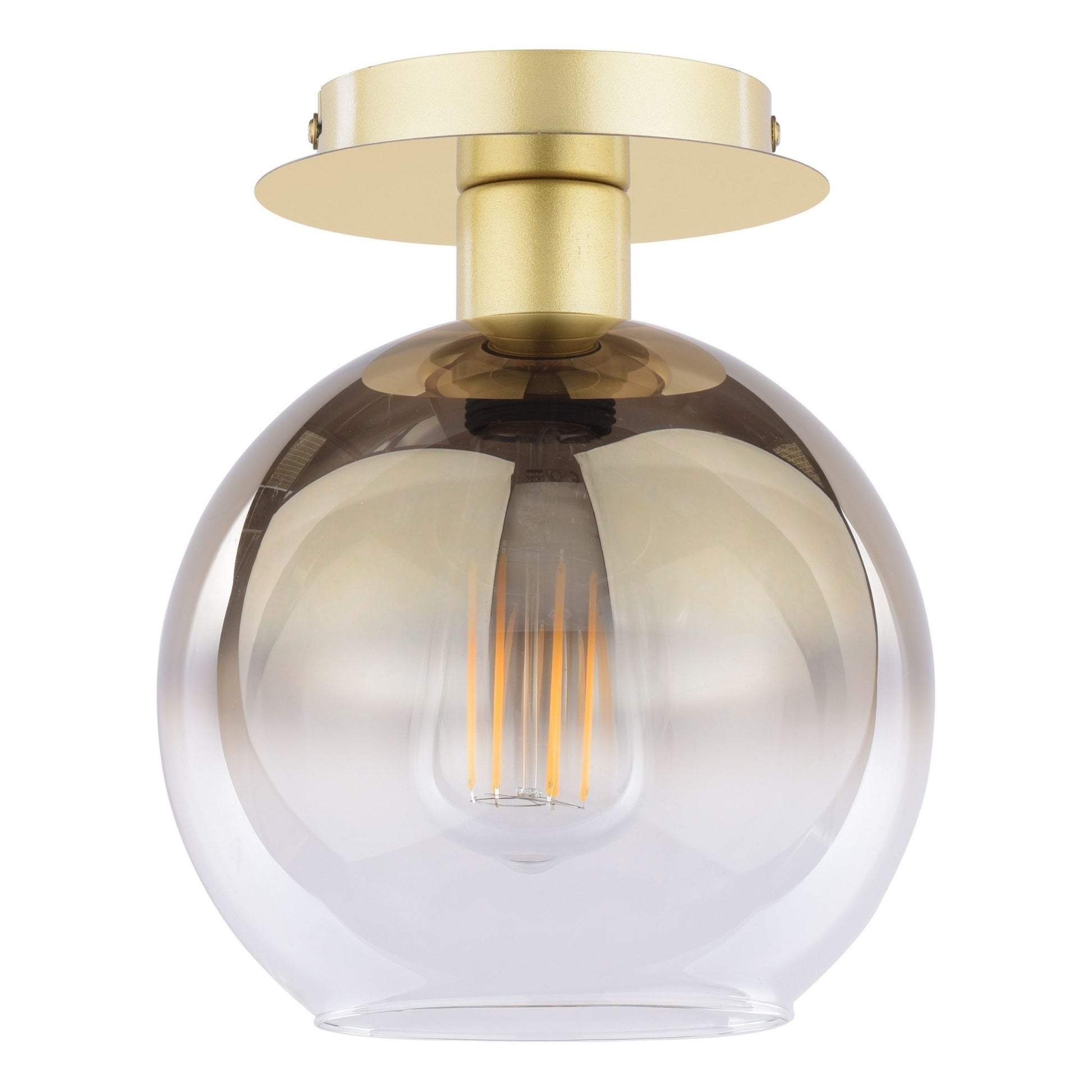 Lycia 1-light semi-flush ceiling light, featuring a large, ombre gold glass globe shade and a mirrored ceiling fixture with satin gold detailing.