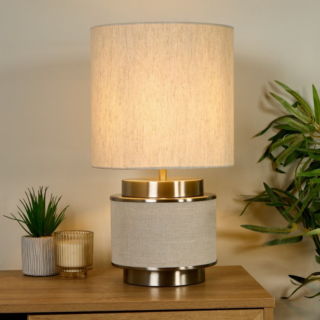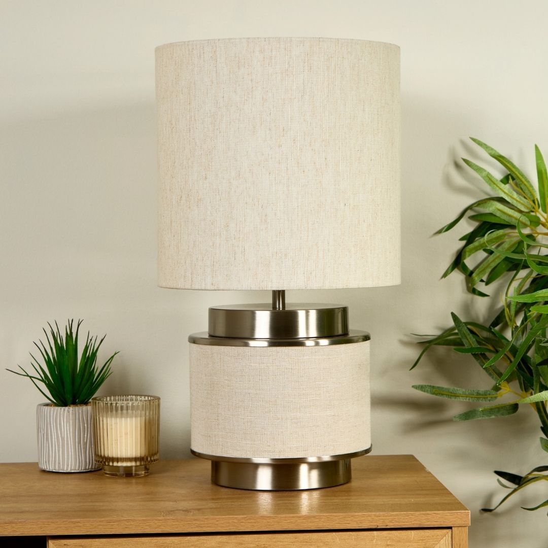 A statement piece that blends bold design with timeless elegance, this lamp features a chunky natural hessian base paired with satin nickel accents, creating a striking contrast that adds character to any room. Topped with a matching tall drum shade, it offers a soft, ambient glow, making it ideal for both reading and relaxing. Perfect for living rooms, bedrooms or offices, the Marriot table lamp combines classic and contemporary elements, ensuring it complements a variety of decor styles. Its mid-century design and luxurious finish make it a standout addition to your space, providing both illumination and a touch of sophisticated style.