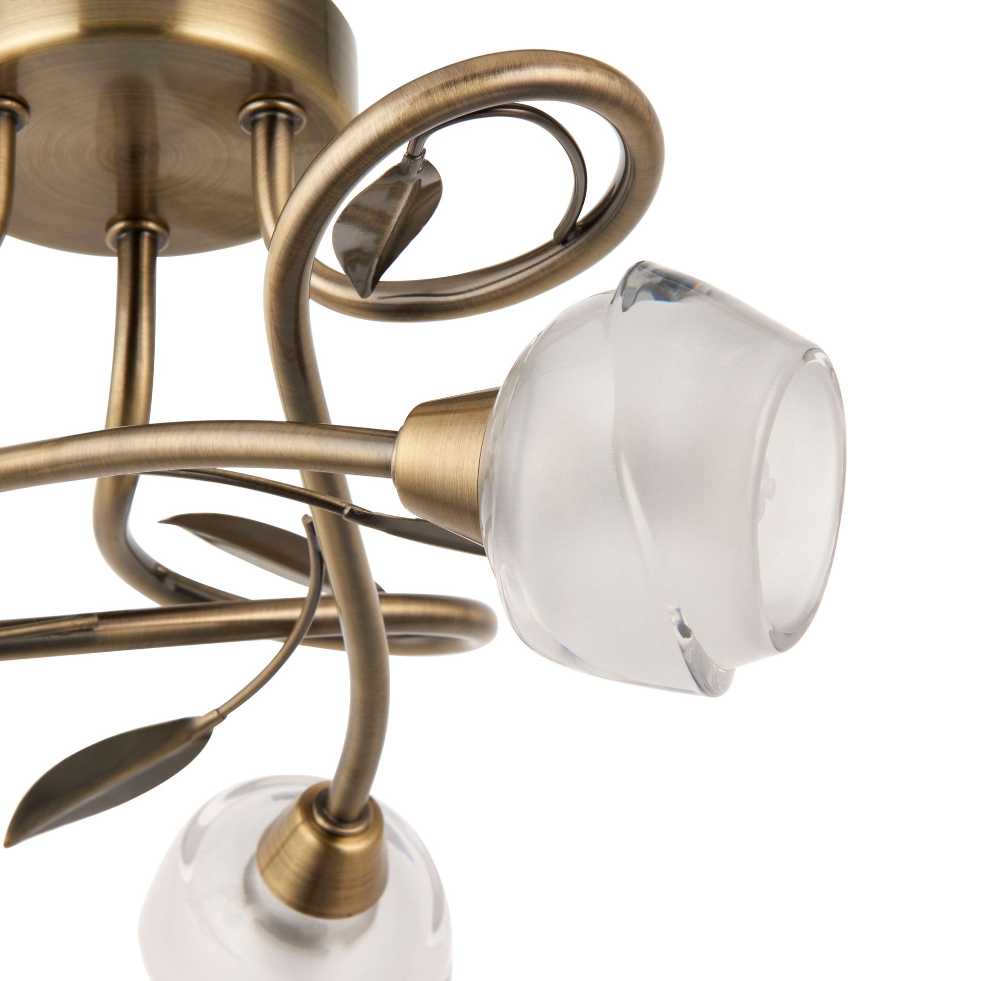 An elegant addition to your home, this ceiling light is part of the Maywood range from Pagazzi Lighting. Finished in antique brass throughout, the fitting boasts 3 rose shaped glass shades with an acid inner finish. Each shade is supported by a swirled arm with leaf detailing. Ideal as a feature in any living room or hallway.