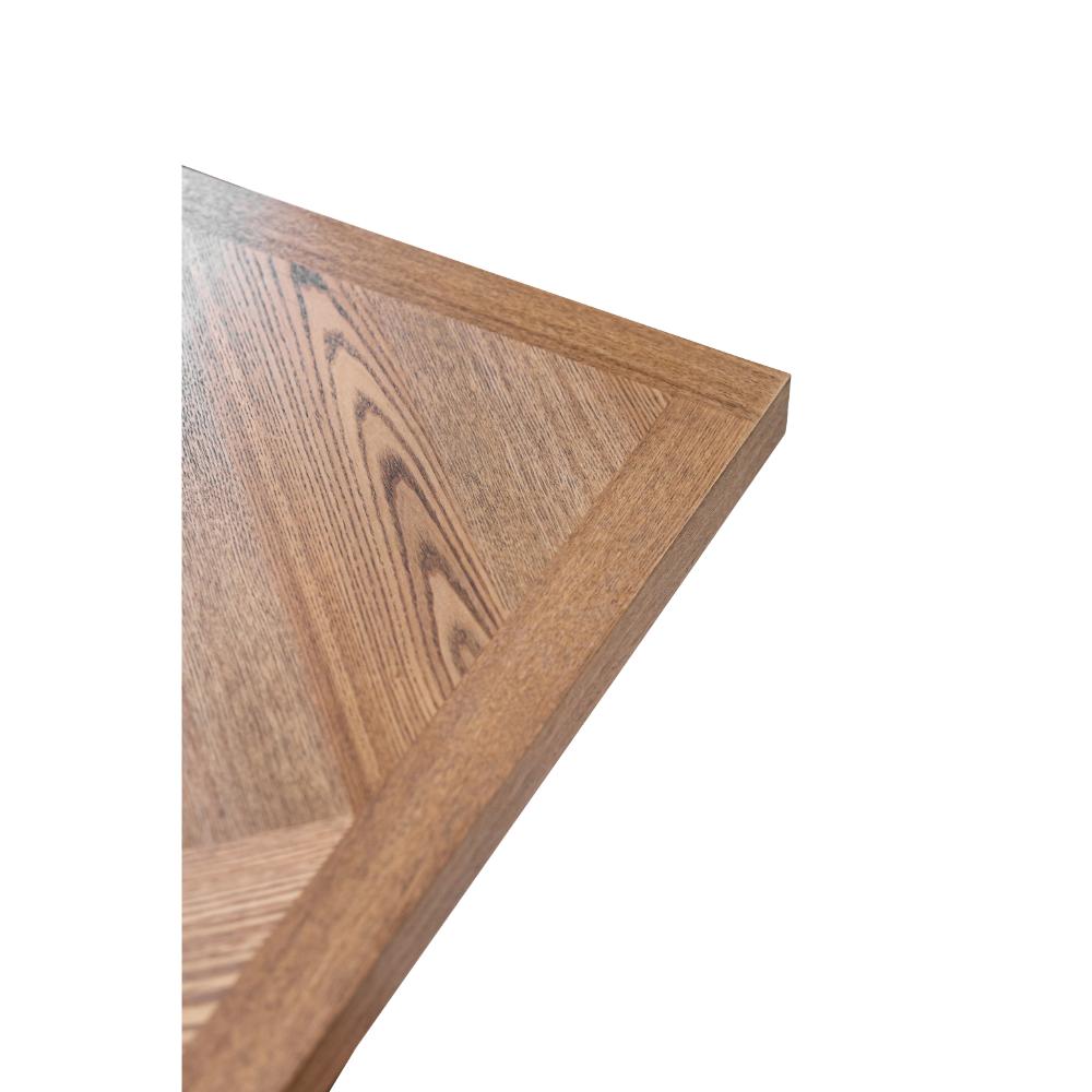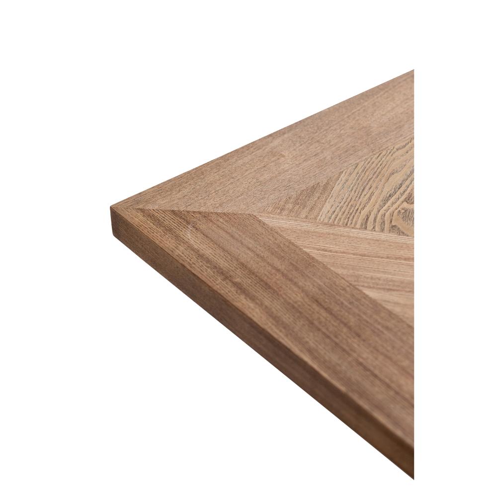 The dining table is a simple yet classically designed piece of furniture. The beautiful parquet hand designed inlay adds character and is complimented with a warm medium oak finish. Constructed using MDF and real oak veneers, the top sits on an x-frame style black powder coated base. Simple design using detailed craftmanship.