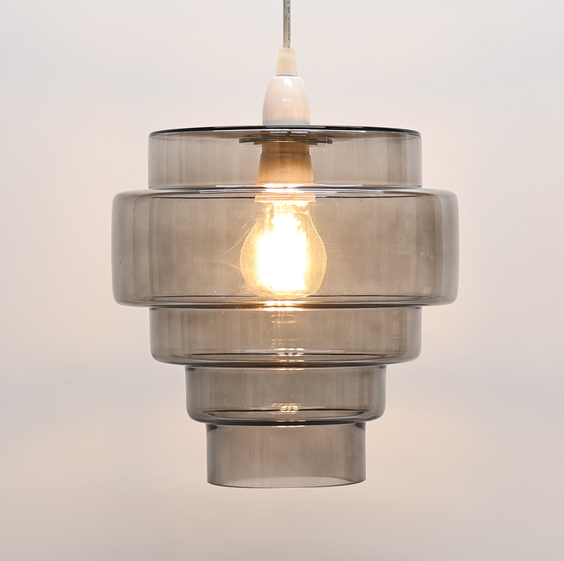 Showcasing a striking 5-tier layered shade crafted from smoked glass, the Mira pendant brings depth, elegance, and a touch of vintage glamour to any room. Its reflective finish pairs beautifully with decorative bulbs, creating a warm, ambient glow.