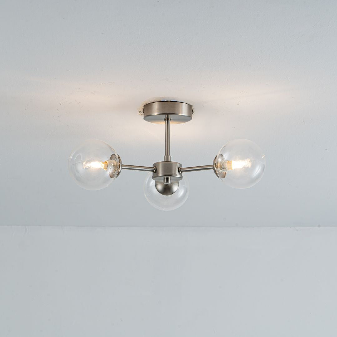 Add a sleek, modern touch to your home with the Niva 3-Light Satin Nickel Clear Glass Semi-Flush Ceiling Light, exclusively from Pagazzi Lighting. This stylish fitting features three clear glass globe shades arranged on a satin nickel frame, creating a striking yet minimalistic design perfect for kitchens, hallways, or living spaces.