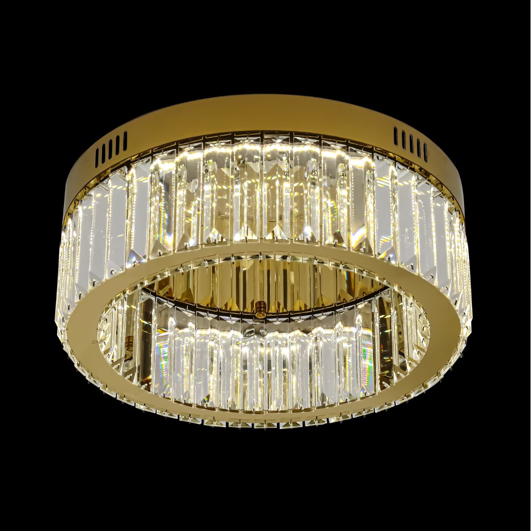 Oda LED flush ceiling light, featuring a round, crystal design, brushed brass detailing and a colour-changing function.