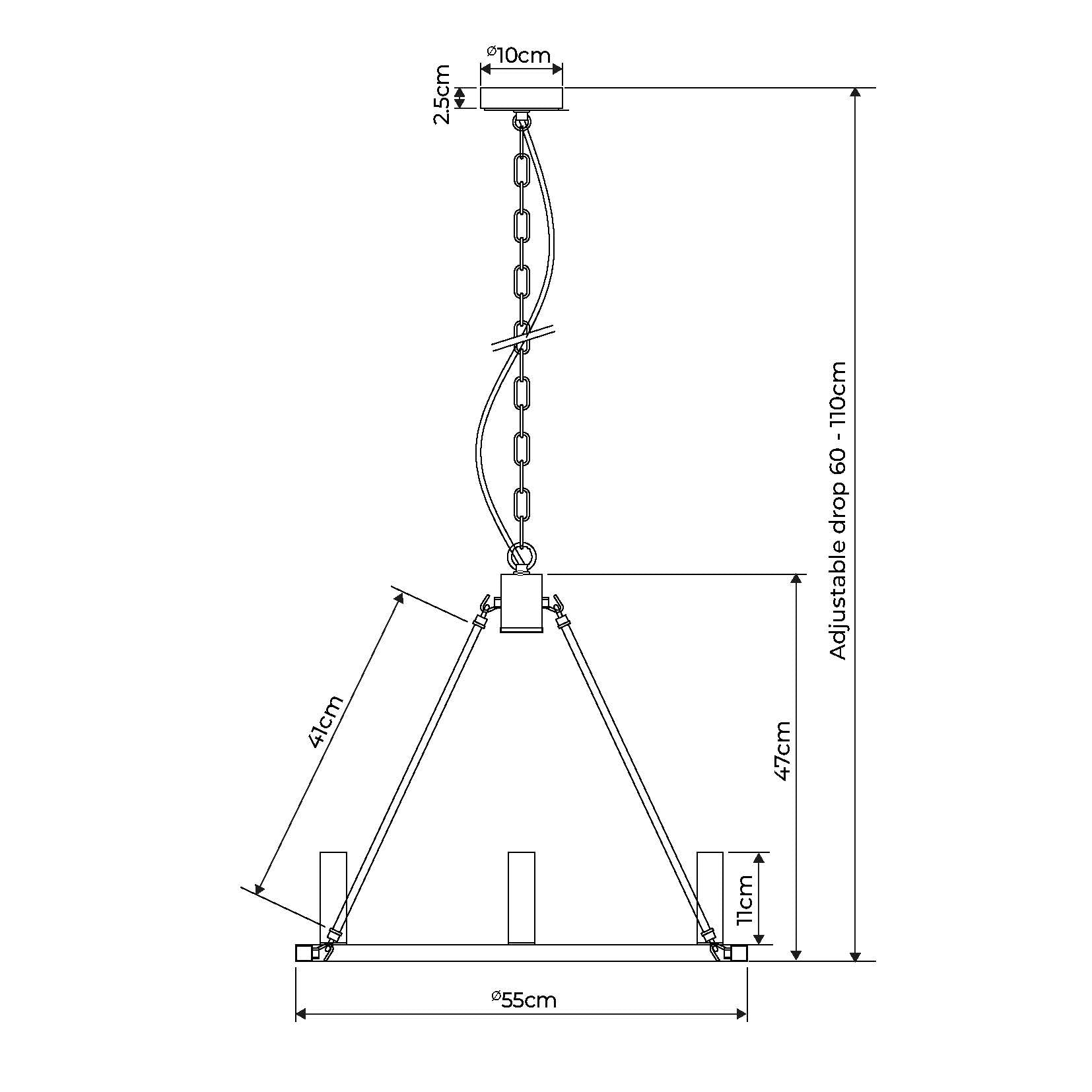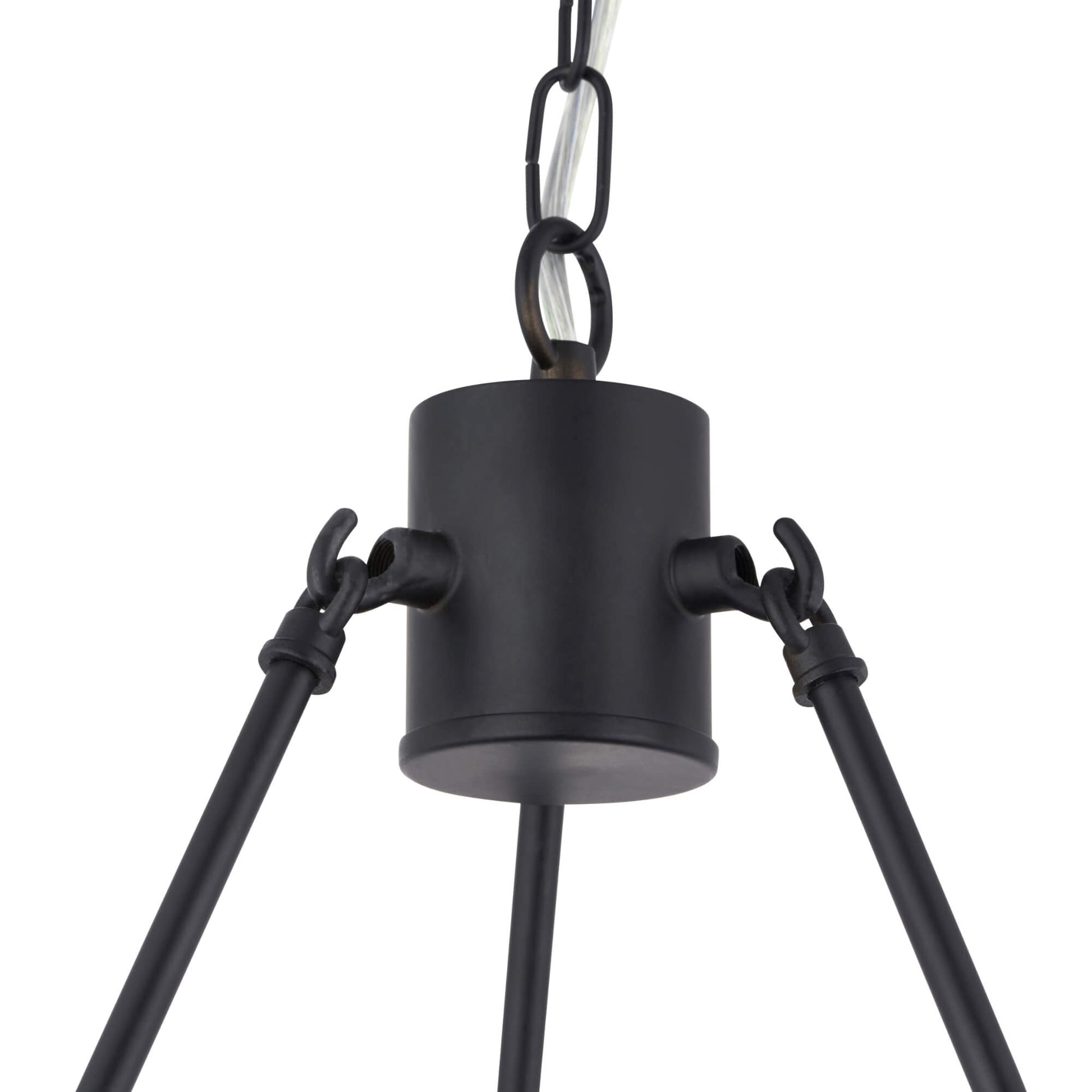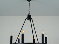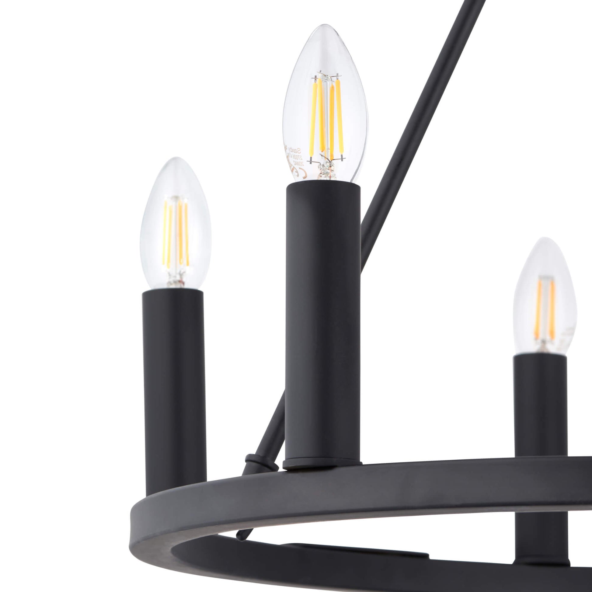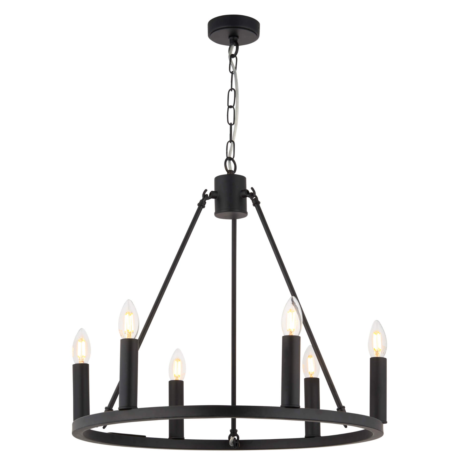 A striking addition to your home, the Parley Pendant Ceiling Light is a stunning focal point. The large pendant boasts a metal ring, of which supports 6 candle light bulbs. The fitting boasts a matt black metal effect paint. Pair it with filament or vintage light bulbs for maximum impact. It is ideal for use in living rooms, hallways and dining rooms.