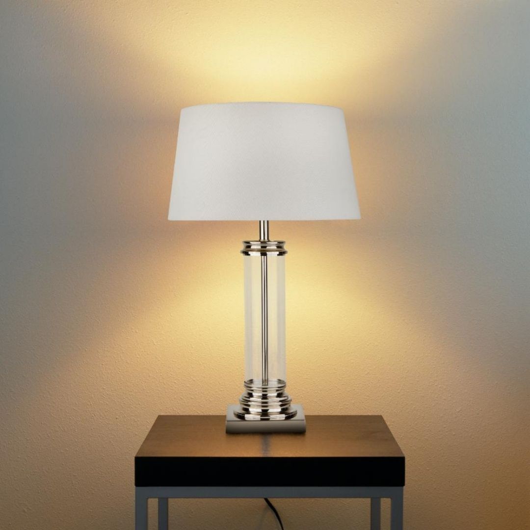 The Pedestal polished chrome table lamp is a perfect fit for any room with traditional decor, with the polished chrome features and clear glass column, it will fit in any room and become an eye-catching feature of the home. With its minimalistic cream shade, the pedestal lamp is the perfect addition to a home that would benefit from a warm glow and added style.
