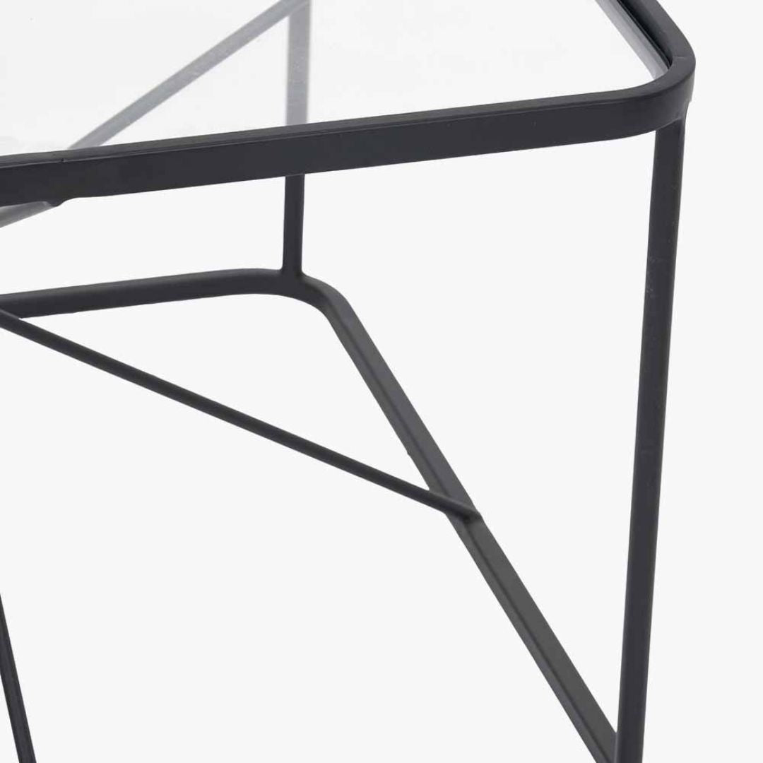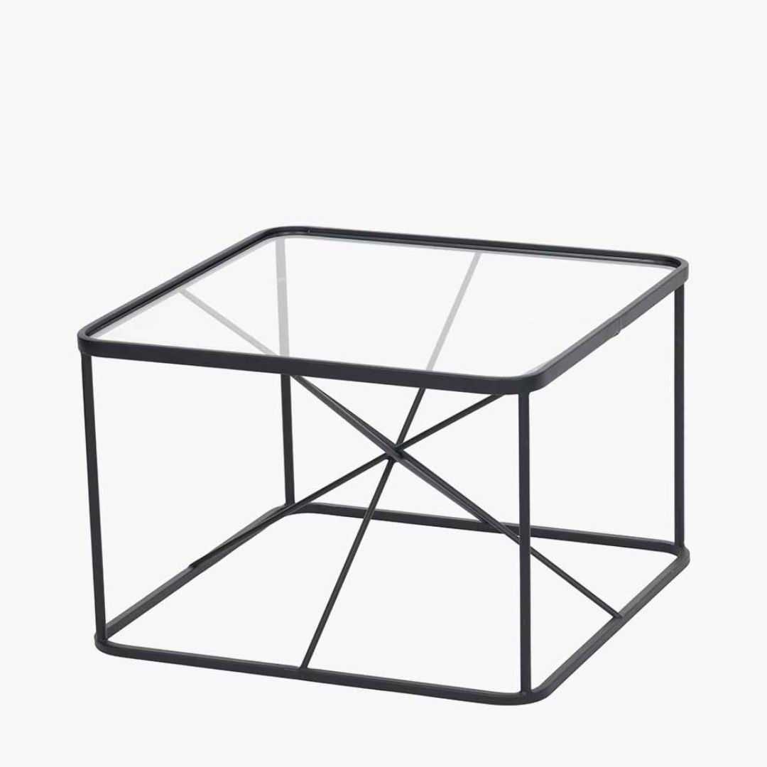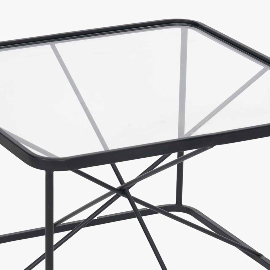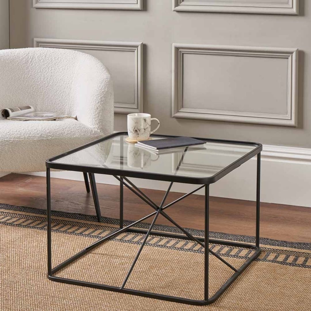 Roxy square coffee table, featuring a crossed black metal frame and inset clear glass top.