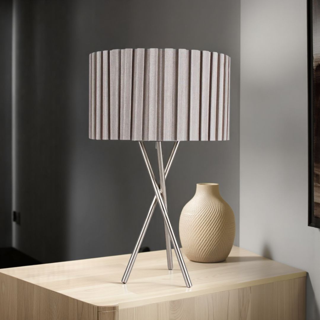An elegant addition to your home, this table lamp is part of the Sabella range from Pagazzi Lighting. Boasting a satin nickel tripod base, it has been paired with a taupe fabric lamp shade. Operated using an in-line switch located on the cable, it is perfect for use in lounges, hallways and as a bedside lamp.