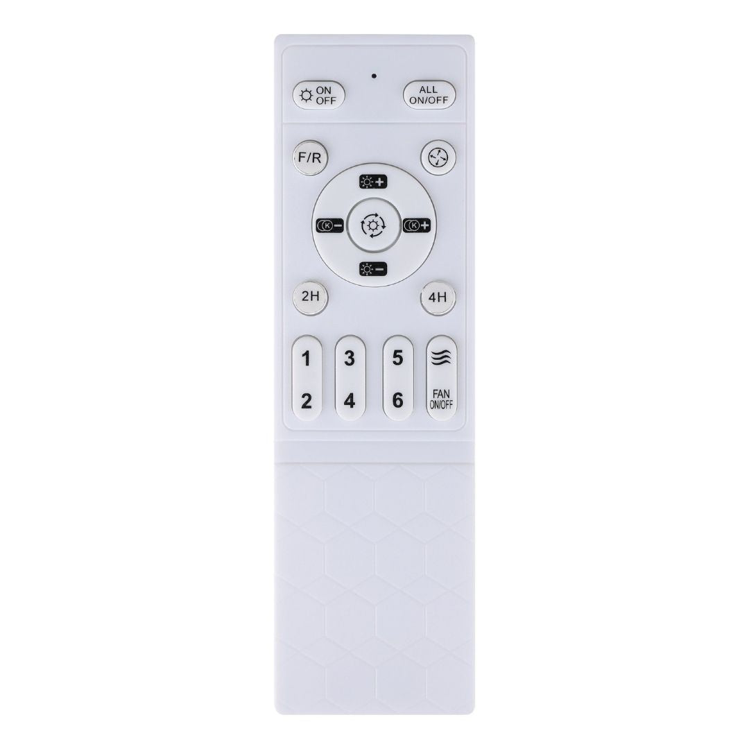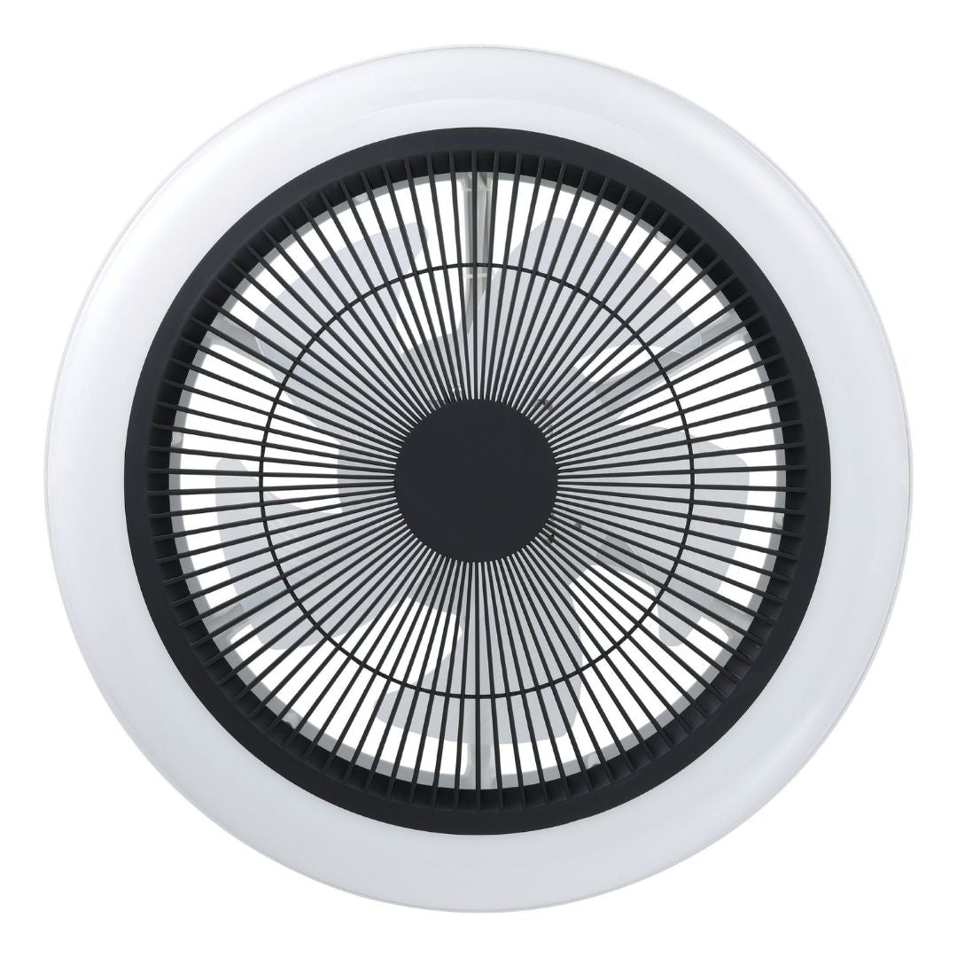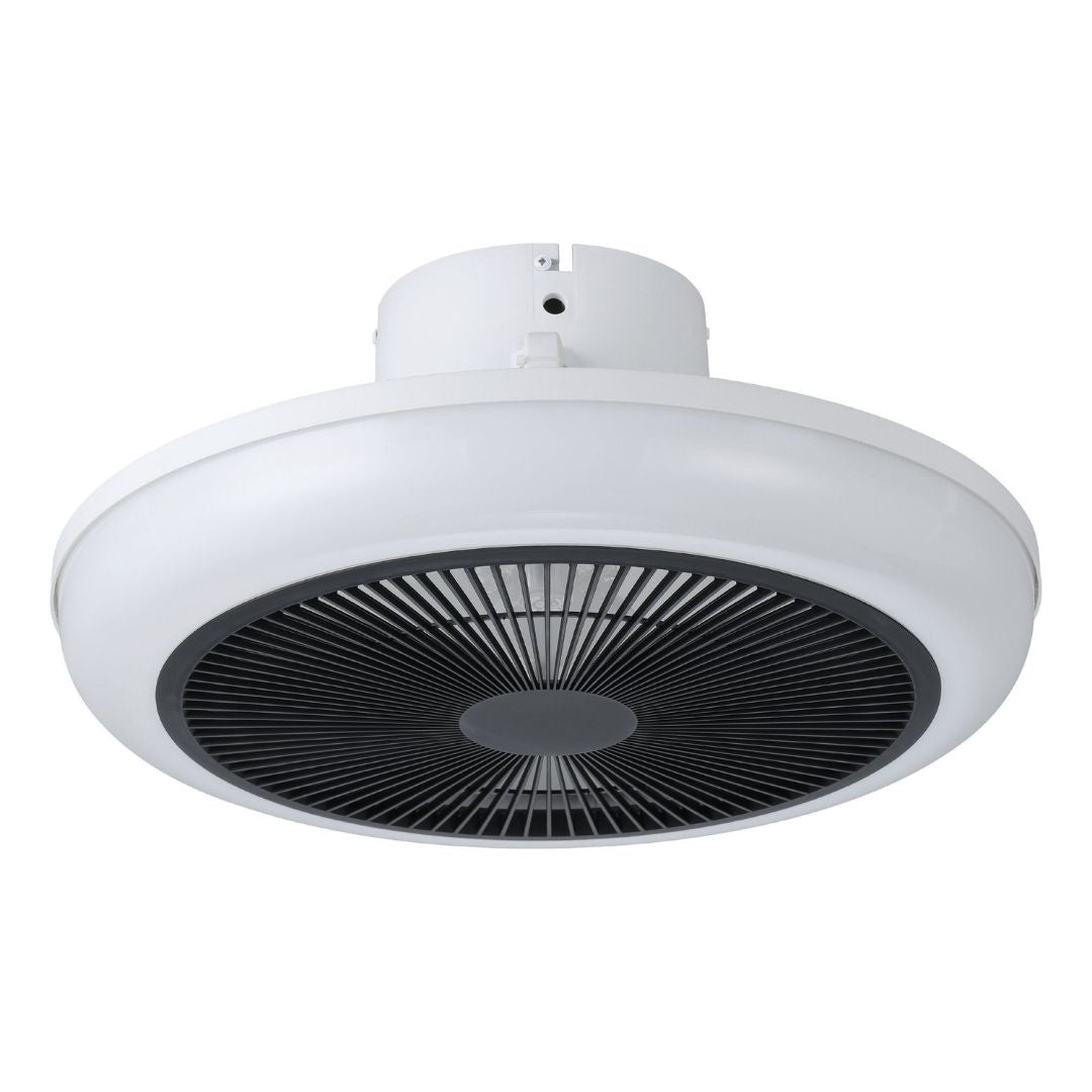 Sayulita LED ceiling fan, featuring a white plastic body with black accents.