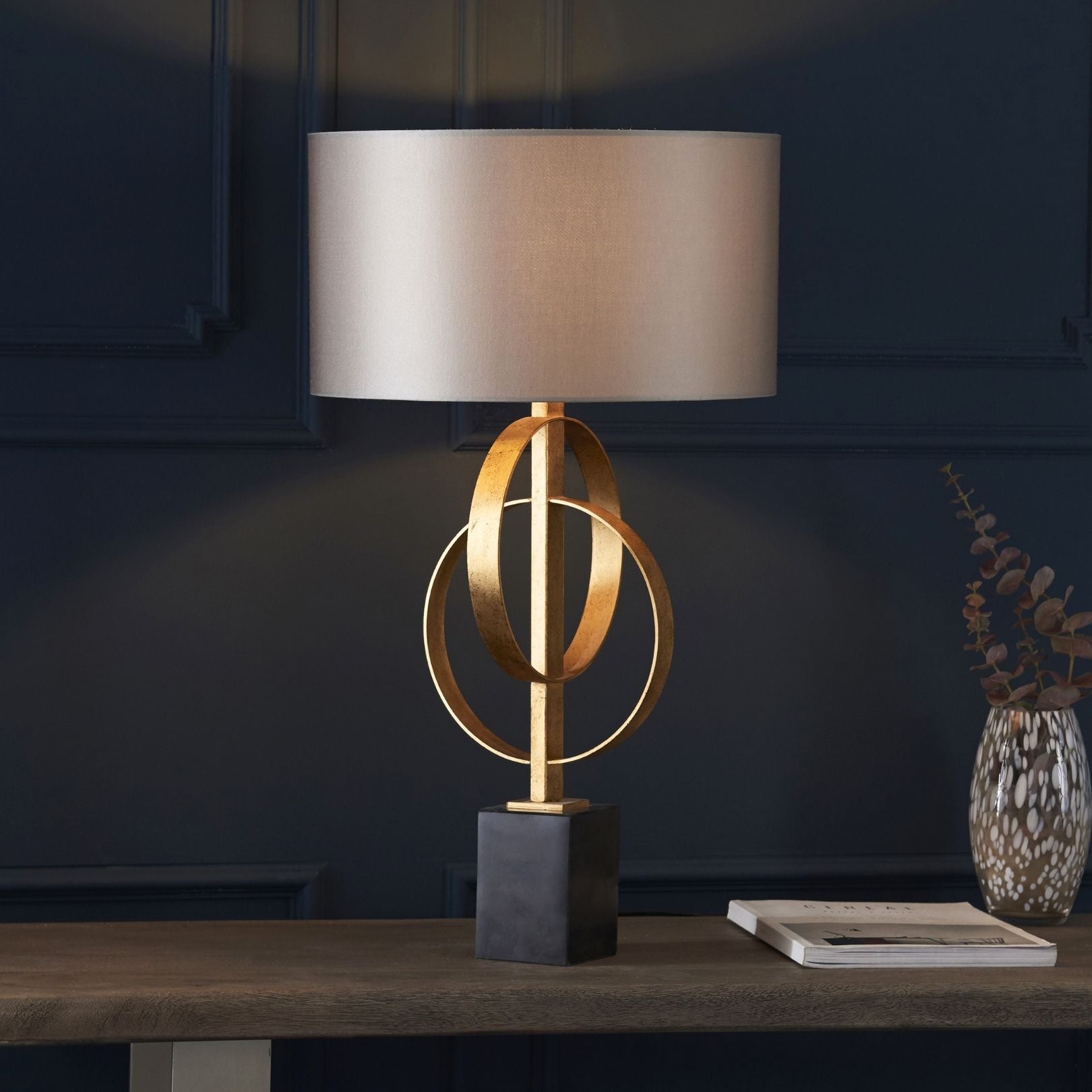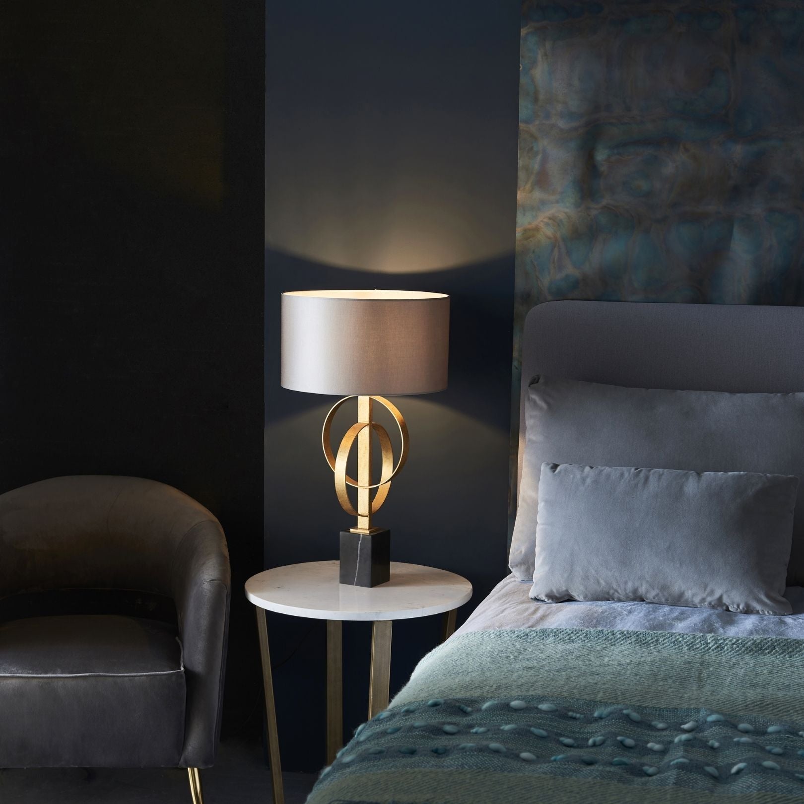 Serenity 1-light table lamp, featuring antique gold leaf metalwork, a mink-coloured, satin fabric drum shade with matching liner and a black marble base.