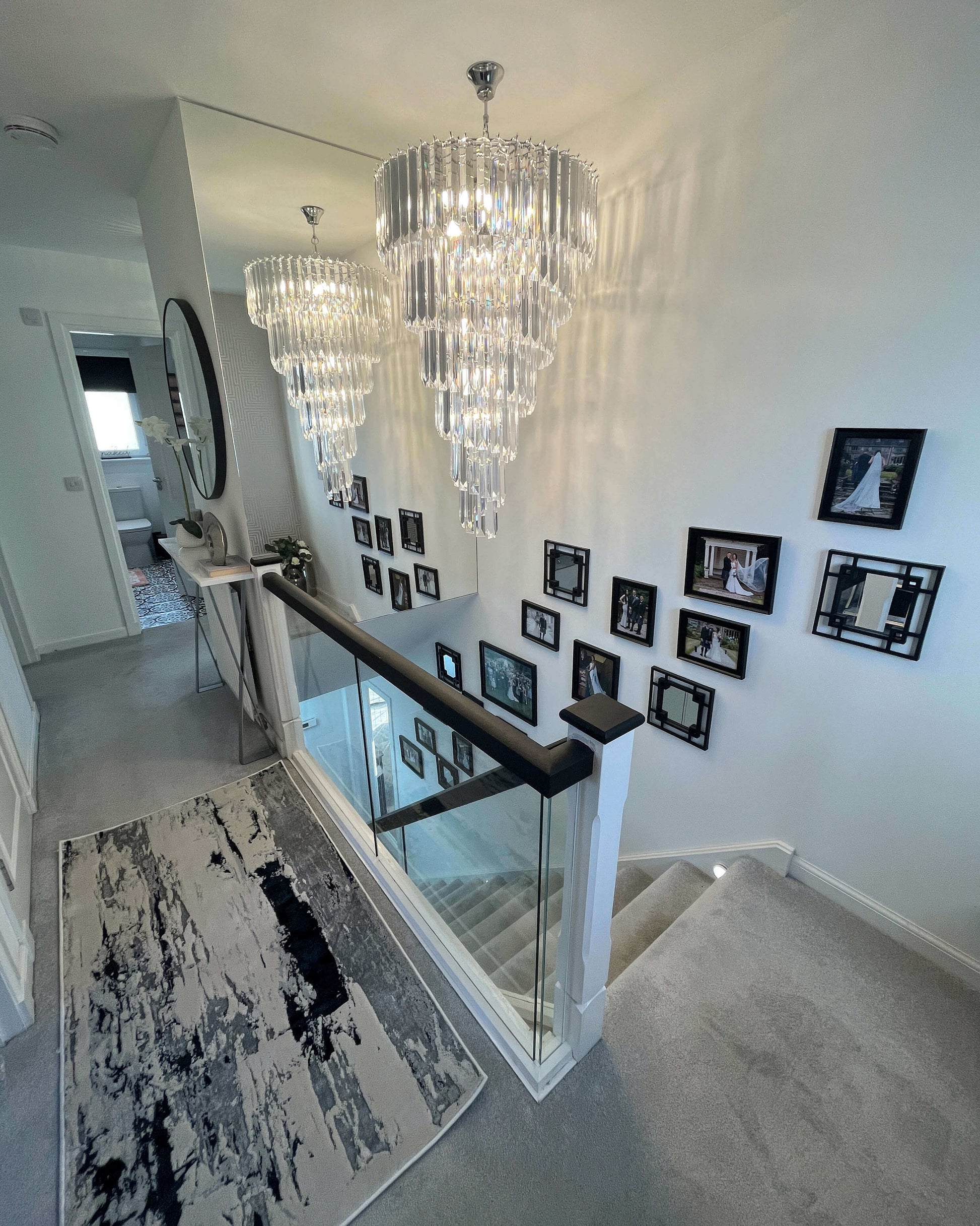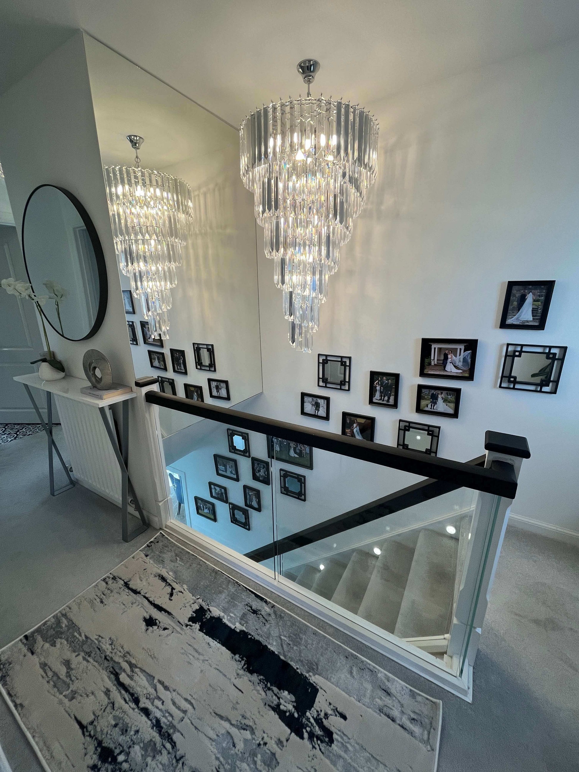The Sigma 9 light chandelier is a striking blend of vintage elegance and bold silhouettes. The chrome finish frame is draped in cascades of shimmering acrylic prism drops which reflect the nine lights beautifully for a glamorous elegance that will make a magnificent centre piece to any large living room or hallway. The chain suspension can be adjusted for different ceiling heights.