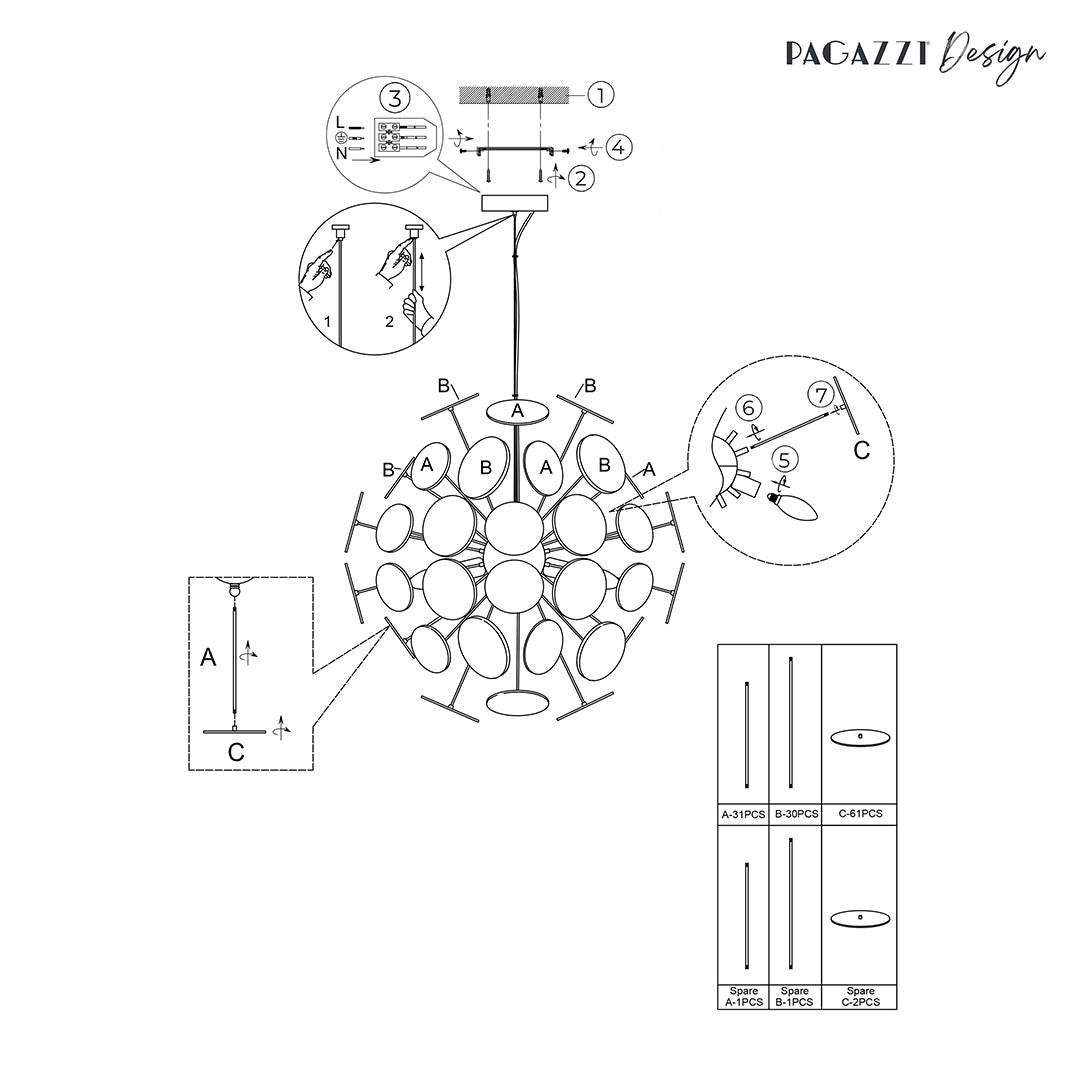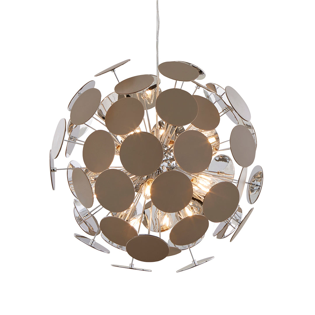 From its central chrome sphere, multiple metal rods extend outward, each tipped with a smooth circular disc that catches and reflects the light beautifully. The six E14 SES bulb fittings sit at the heart of the design, delivering a radiant and multidirectional glow. The pendant’s reflective surfaces amplify the light output, filling your space with an impressive sparkle and depth that draws the eye from every angle.