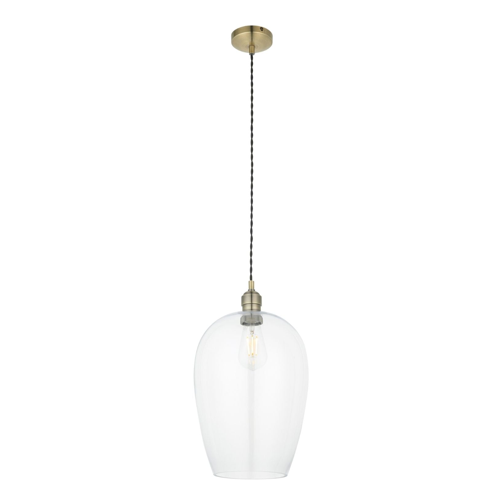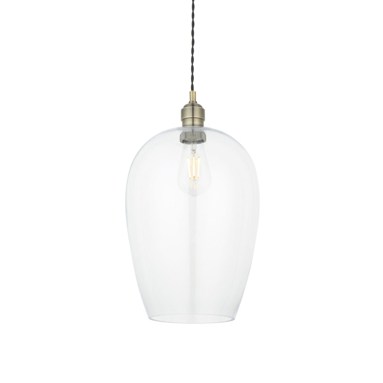 Stourton 1-light pendant ceiling light, featuring a clear blown glass shade and antique brass metalwork.