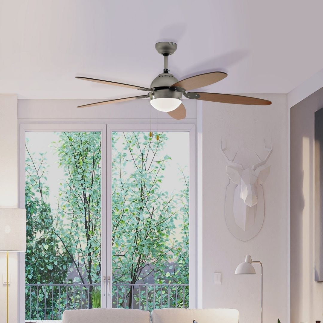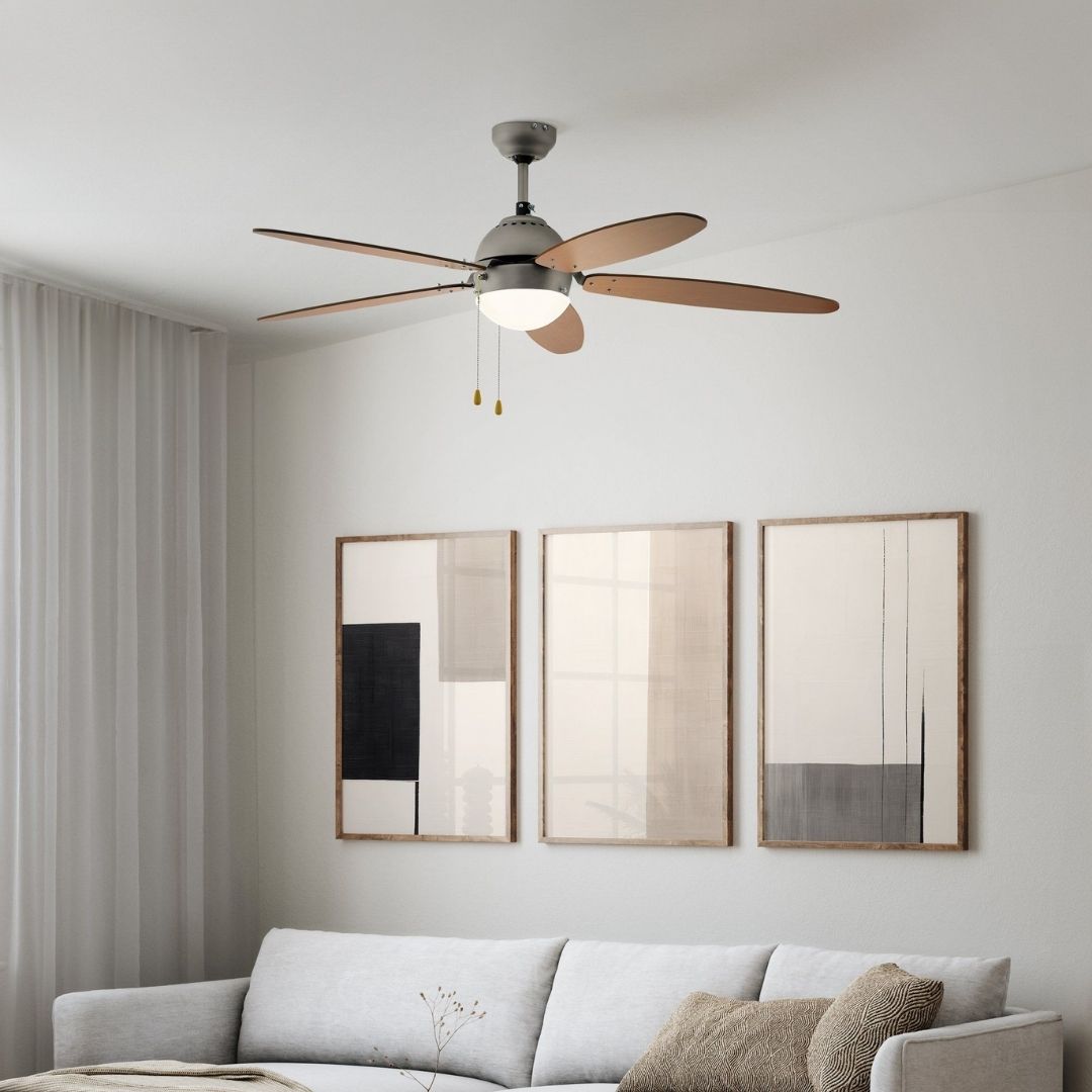 The Susale ceiling fan blends classic design with modern functionality by offering both lighting and air circulation in one elegant fixture, adding a sleek, contemporary touch to any room. The five wood-effect MDF blades provide a stylish contrast while efficiently moving air throughout the space. Designed with convenience in mind, the fan includes both pull cords and a remote to control the integrated light and three adjustable speed settings, allowing you to tailor the airflow to your comfort. The fan is also equipped with a reversible rotation function—summer mode for a cooling breeze and winter mode to redistribute warm air—making it ideal for year-round use. Powered by a durable built-in AC motor, the Gelsina fan ensures reliable performance and energy efficiency, with an airflow-to-power ratio of 2.61 (m³/min)/W. Whether placed in a living room, bedroom or study, this fan is a practical and stylish solution for maintaining a comfortable indoor climate.