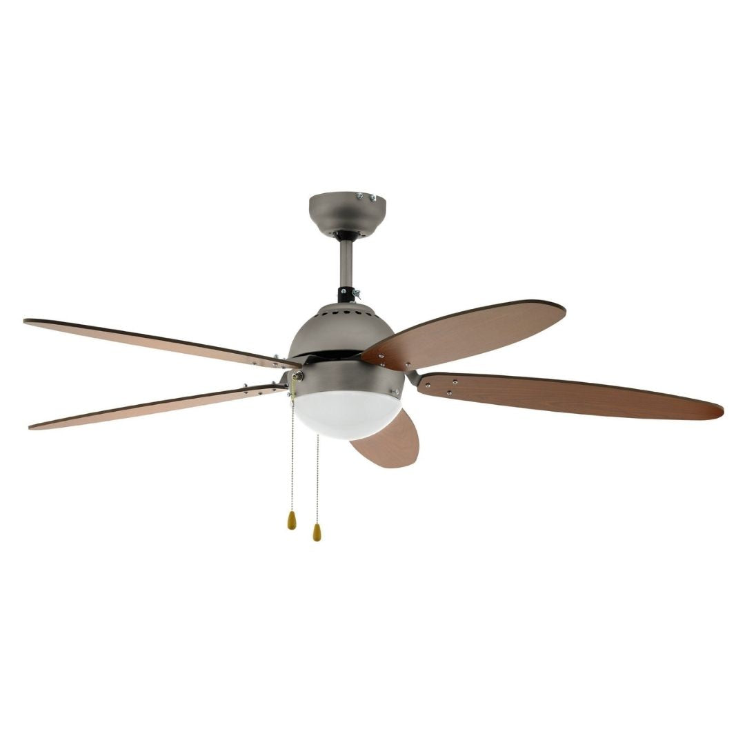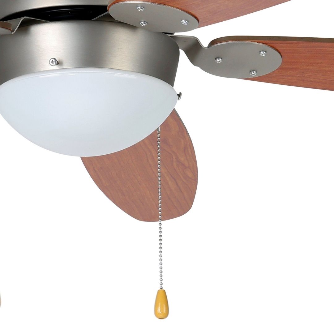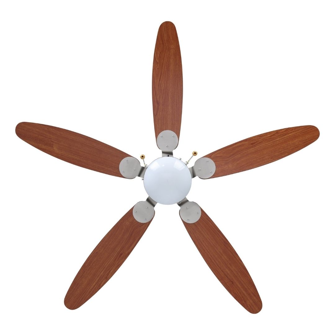 Susale 1-light ceiling fan, featuring a satin nickel finish, red-brown wood effect blades and a painted glass diffuser.