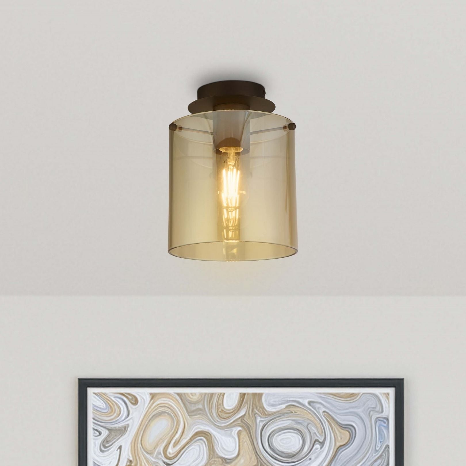 Sweden 1-light flush ceiling light, featuring a mocha-coloured metal ceiling plate and an amber glass cylindrical shade.