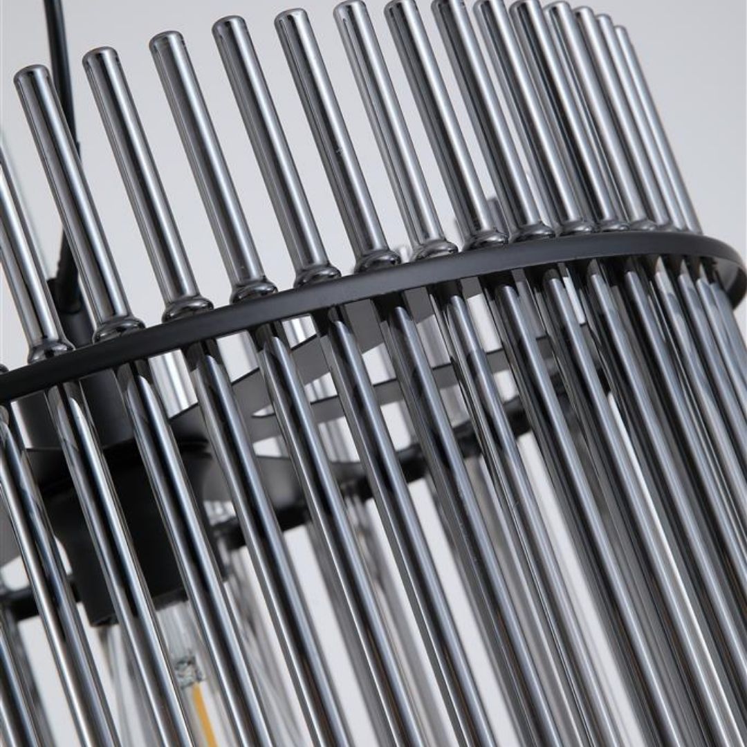 Elevate your space with the Swizzle Pendant – a contemporary fusion of lighting and art. Its precision-arranged cage of black smoked glass rods creates an architectural statement that captivates both illuminated and unlit. When lit, a radiant band of light glows through the glass, transforming the pendant into a luminous centrepiece that enhances any interior. Ideal for dining rooms, bedrooms, living areas, or minimalist kitchens, the glass rod design casts intricate shadows while creating a sophisticated ambience.