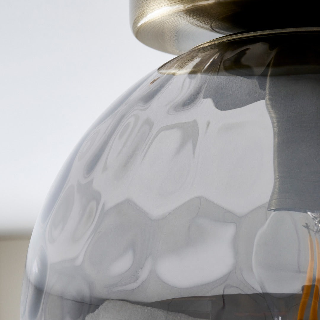 This flush-fitting light features a warm antique brass plate and a single smoke mirrored dimple glass globe, creating a beautiful play of light and subtle reflections. The textured glass adds depth and interest, while the warm metallic finish complements both traditional and contemporary interiors.