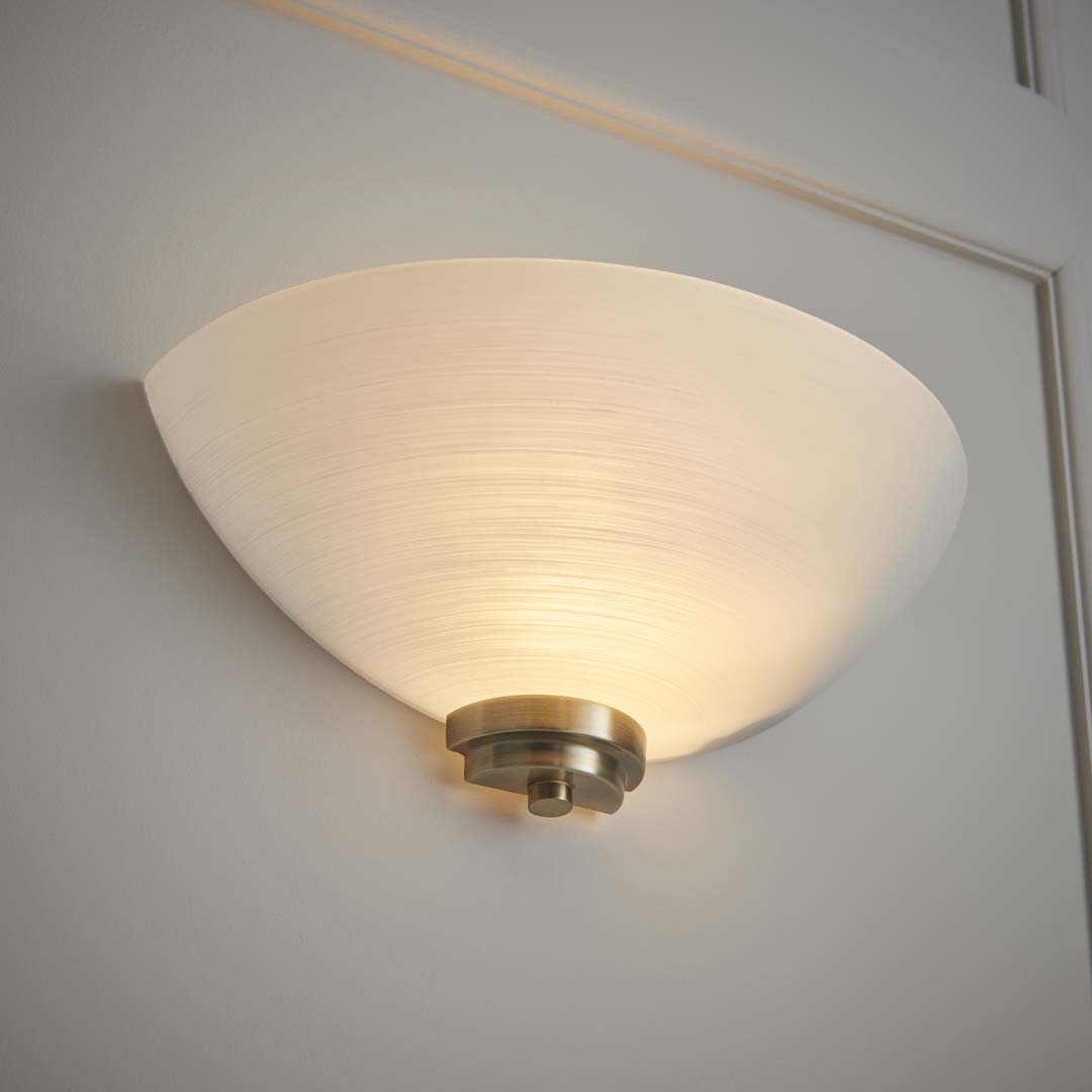 A beautiful addition to your home, this wall light is part of the Welles range from Endon. Finished in antique brass throughout, the light bulb is housed within a glass shade with antique brass detailing at the bottom. The shade has been painted white and boasts a very faint line pattern. It is set to look great in living rooms, dining rooms, hallways and bedrooms.
