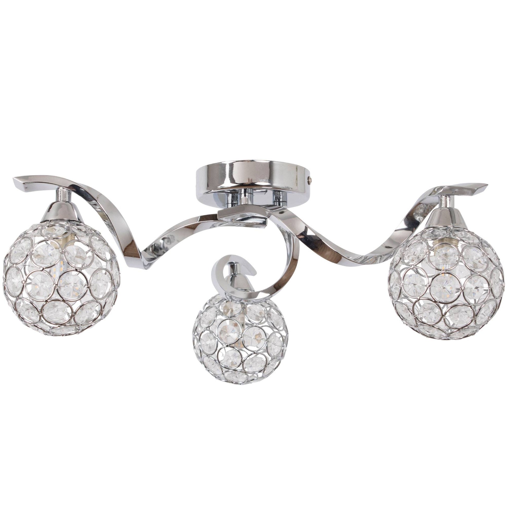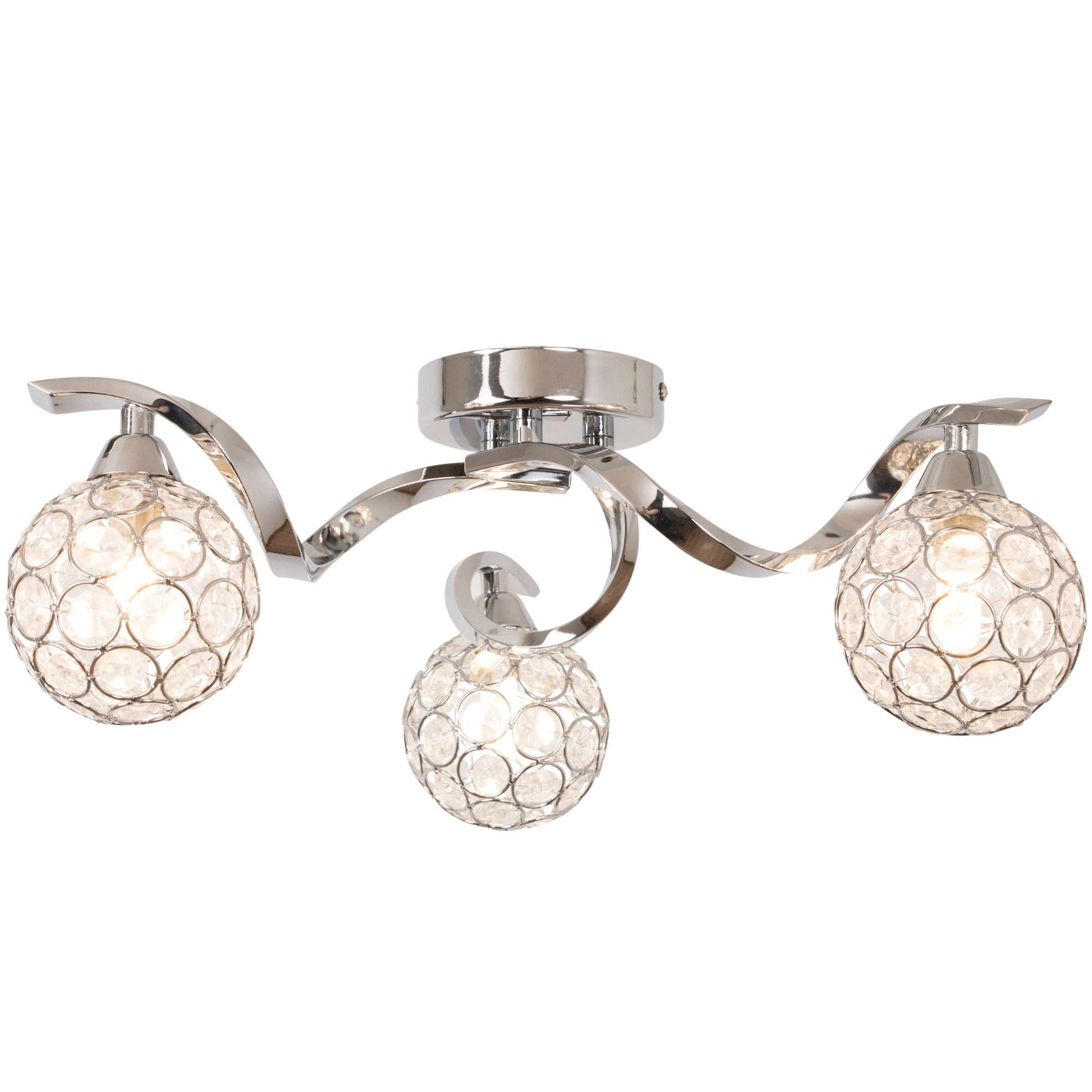 A beautiful addition to your living space, this ceiling light is part of the Zana range from Pagazzi Lighting. Finished in polished chrome throughout, the piece boasts 3 spiral arms, of which a globe shaped shade is attached to each. Each of the shades are metal with acrylic beaded detailing, offering a gorgeous effect when lit. Perfect for use in bedrooms, lounges or in hallways.